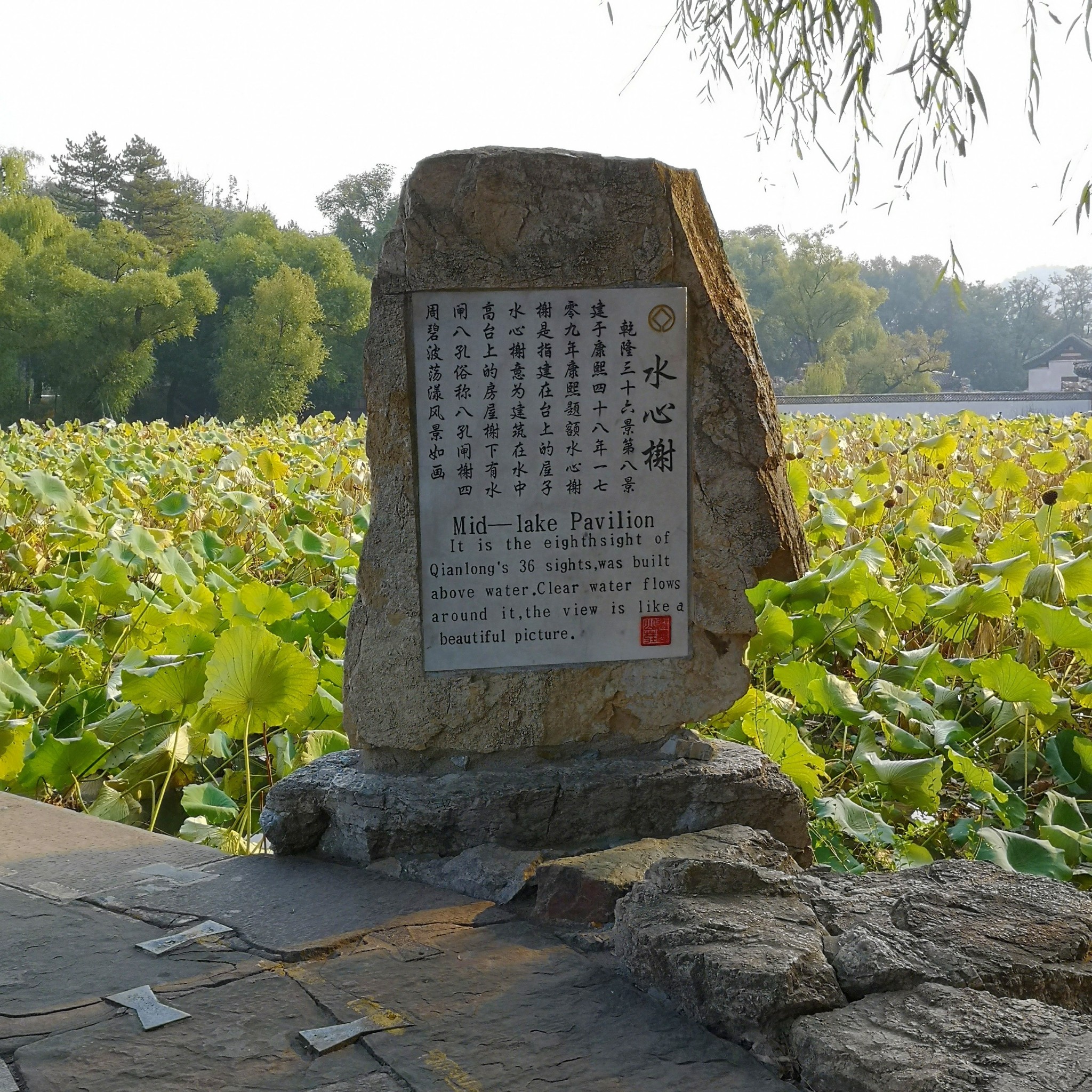 水心榭两边是下湖和银湖。下湖,湖面如镜,绿水含烟,荡舟水上,心旷神怡;银湖里则是接天莲叶无穷碧,映日荷花别样红。这是隔银湖看水心榭诸亭。