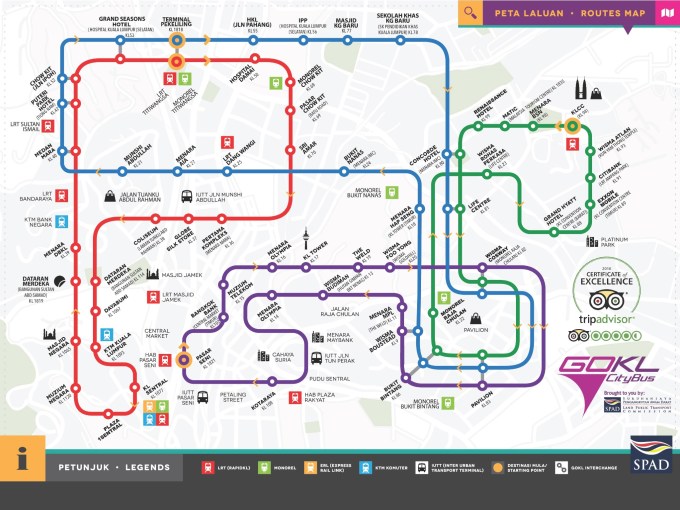 免费巴士GO KL CITY BUS:可以搭乘免费的城市巴士GO KL CITY BUS抵达观光区,一共分为绿、紫、蓝、红4条路线,只需在有“GO KL”标志的巴士站等待。巴士内配有免费的无线上网(WIFI)服务。你可以随意地上车下车,完全无需付任何费用。