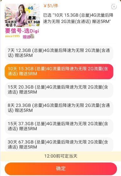 我们买的套餐:10天5.3GB高速4G流量+每天13:00~19:00时间段1GB高速4G流量+无限量2G流量+RM.5通话费