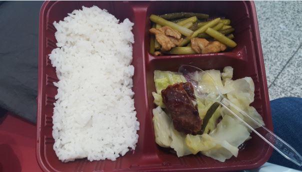 大概18点的时候,机场小姐姐广播为我们提供了免费盒饭,嗯,领完盒饭来了个亚洲蹲...