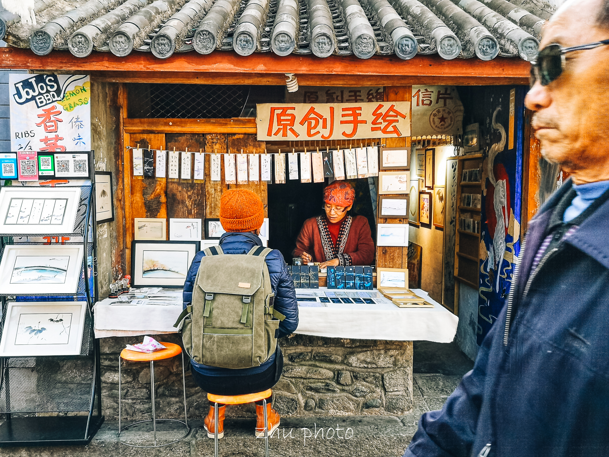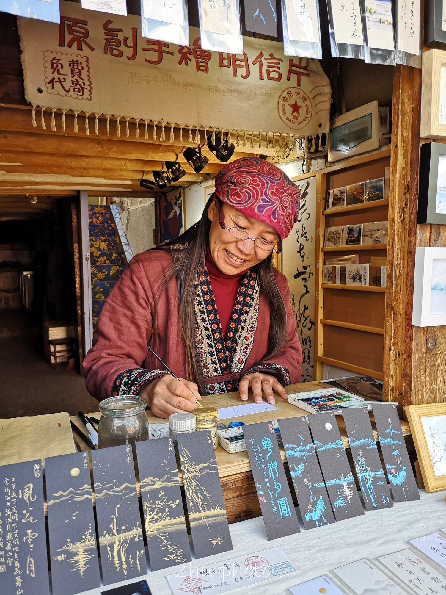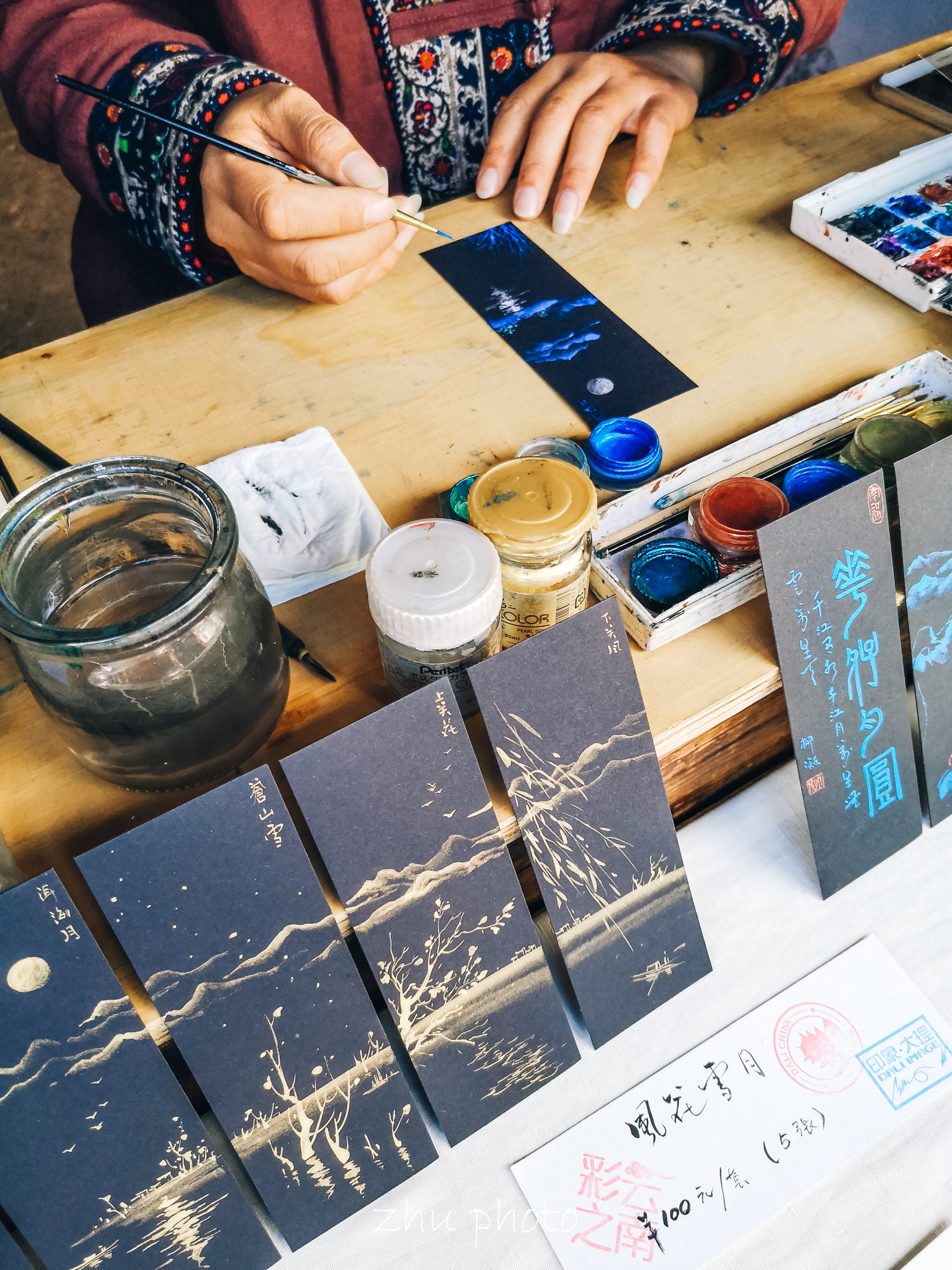 我看到一位正在画手绘明信片的画者正在潜心画画,那苍山雪洱海月下关风让我一下就走不动路了。
