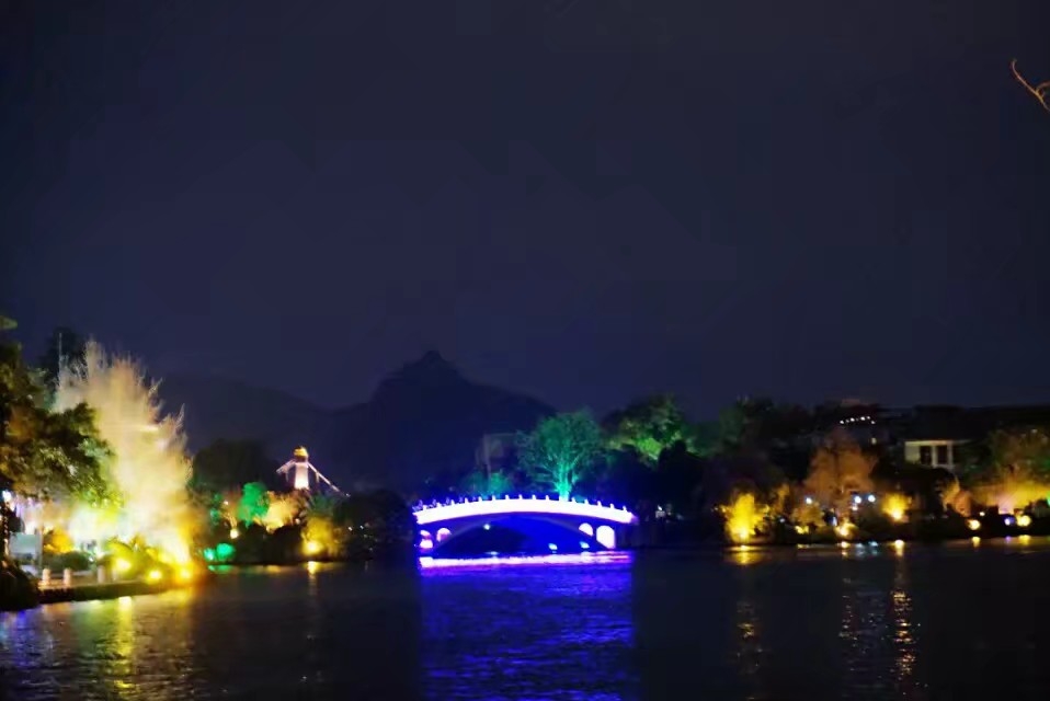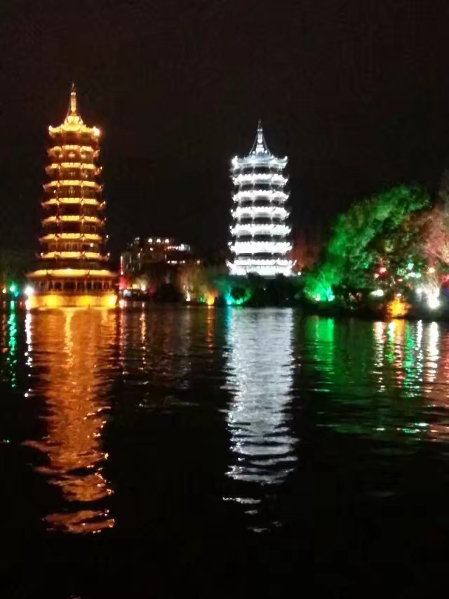 晚餐后徒步游四湖:杉湖、榕湖、桂湖、木龙湖,双塔,桂林著名两江四湖,也可以坐船观夜景,两餐美味吃的太多,我们就悠闲的步行观赏了桂林夜景!