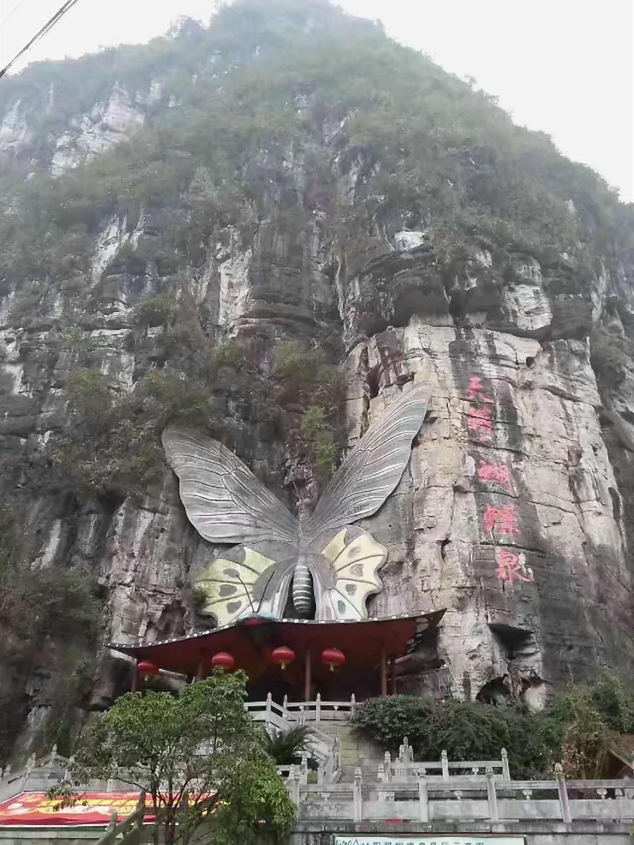 继续往前骑,经过的第二个景点天籁•蝴蝶泉,蝴蝶泉的大门满有特色的,很大的一只蝴蝶,可以拍下照片留念,不值得花钱进去。里面是个溶洞,还有些表演,也挺商业气息的。