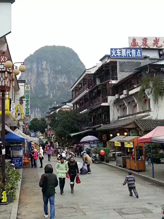 此时到了漂流的终点兴坪,我们的票包含了去往兴坪的车站,(从兴坪到古镇乘车再到阳朔)检了票,上了电动车,不一会儿就在一个叫“兴坪古镇”的地方下了车,依山傍水,风景荟萃,粉墙乌瓦石板小巷,是漓江沿岸最美丽的小镇,清静,游客不多,保存了古镇的原汁原味,我喜欢这种感觉。走在古镇的青石路上,拍拍停停···古镇不大,离车站很近,回阳朔的车也很多,15分钟一班,7块钱,半小时左右车程。到阳朔往西街方向走,顺便找客栈,可能是淡季很多很多的客房随你挑,此刻阳朔阴冷,冬季来一定挑选有空调而且是制暖的房间,客栈离西街步行十几分钟,环境不错120元标间,推窗既景。