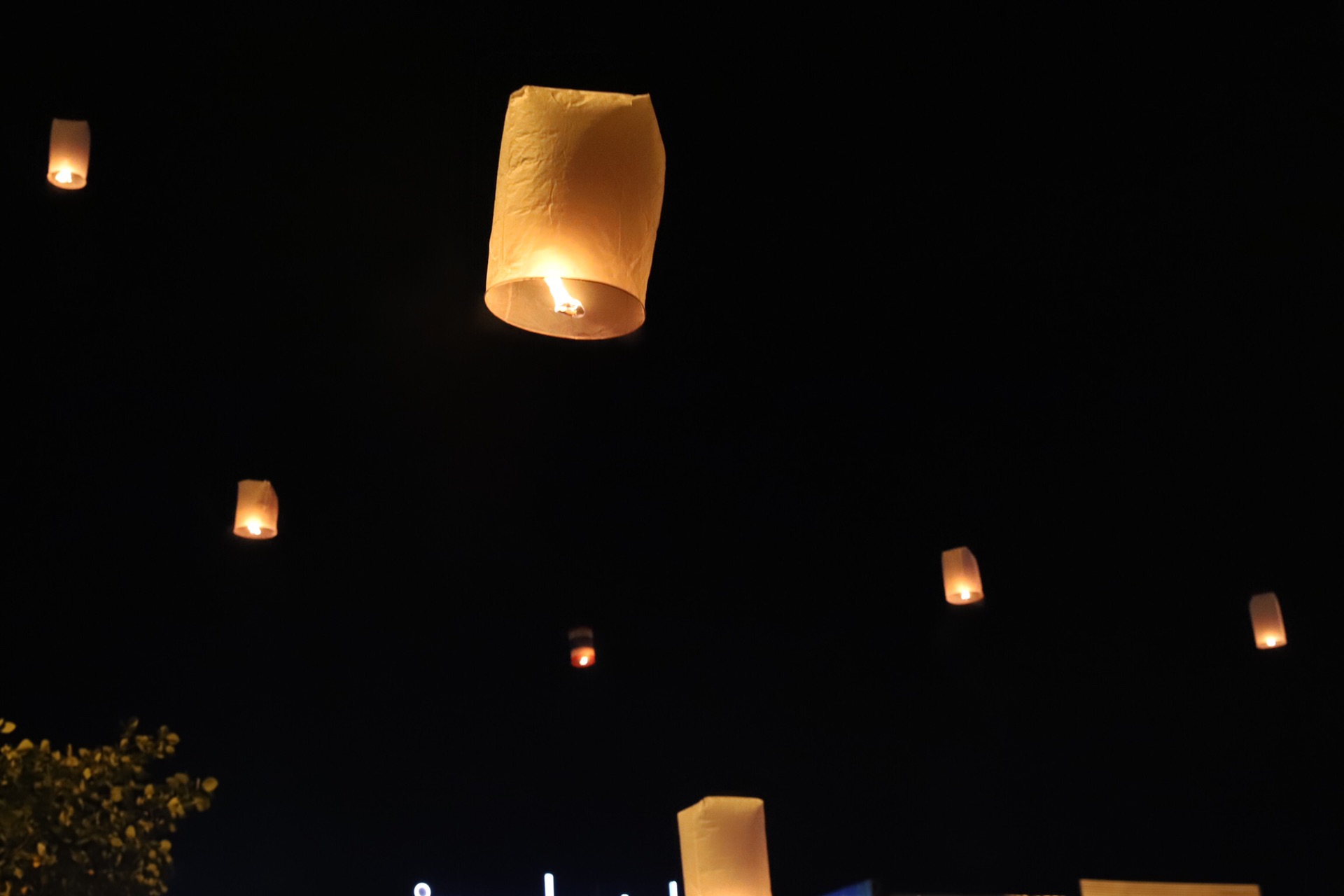 随着越走越近,抬头看到天上放的一些天灯,好开心。