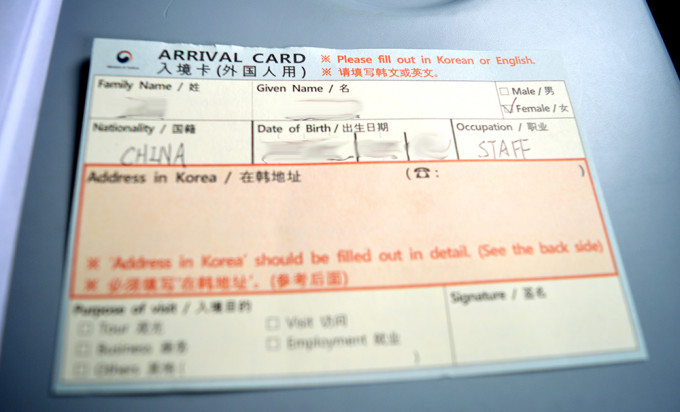 姓、名英文全大写,国籍我也这么写,职业我写STAFF,在韩地址填酒店地址和电话,如果你住其他地方就填真实地址就好了。入境目的勾“观光”(左下那里,相机对焦虚掉了),签名(右下角)用中文。