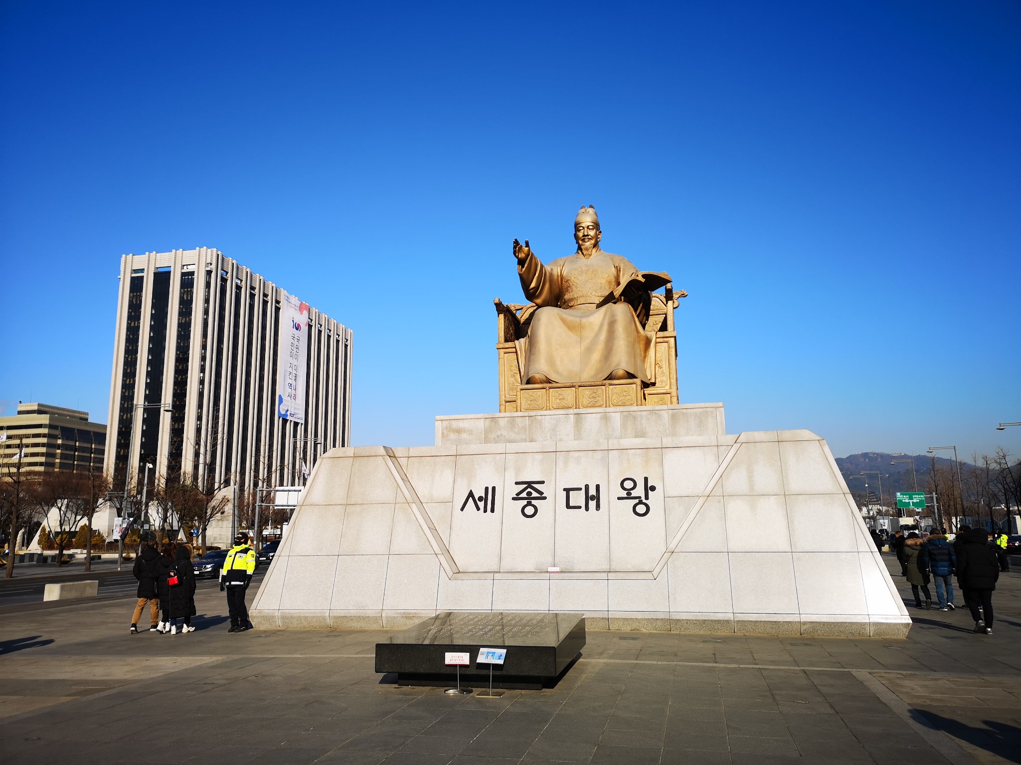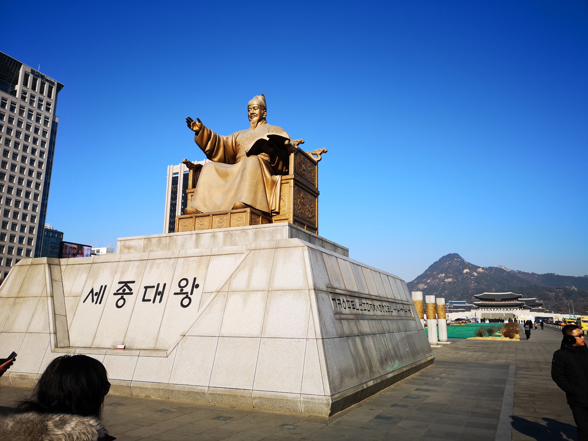 李舜臣将军铜像后不远就是世宗大王铜像。世宗大王应该是韩国人最推崇的一位王,头像也印在万元韩币上,韩国的南极科学考察站也被命名为“世宗王站”。我知道的,大概也就是他创造了韩文,让很多不能读书的老百姓,摆脱了文盲。