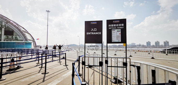 到了大厅入口会遇到检查,检查人员一看登船证,二看通关代码条,只有旅行团的是在外头有贴通关码,自由行散客(专业称谓是“游轮直客”)理论上是可以通过快递提前收到的,但我当时没收,于是只能进入大厅后才能贴码。如果检查人员看你没通关码不让你进,你只需说明自己是直客即可。