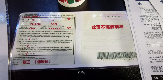 - 接下来就是拿着护照过最后一道关口,此处会将你护照暂时“没收”了,接下来你全程身上只有一个贴着标签的护照复印件作为证件,包括抵达熊本后上岸也是用护照复印件。