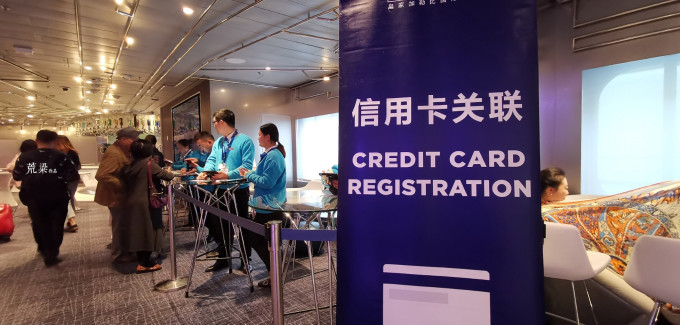 登船后很显眼的过道处有关联信用卡的地方,如果没有提前在值船是挂卡的就可以在这里挂。很多人觉得我不会在船上有任何消费,不需要挂啊。第一,游轮是有每日服务费的收费,必须要交;第二,相信我,或多或少,你都会忍不住有消费的,一定会忍不住的。而且挂了你不消费也并不损失啊。乖,去关联一下不碍事。否则,你还可以选择预付不少于150美金的押金,那更麻烦。对了,船上全部消费都是以美金为单位,基本上不接受现金交易。