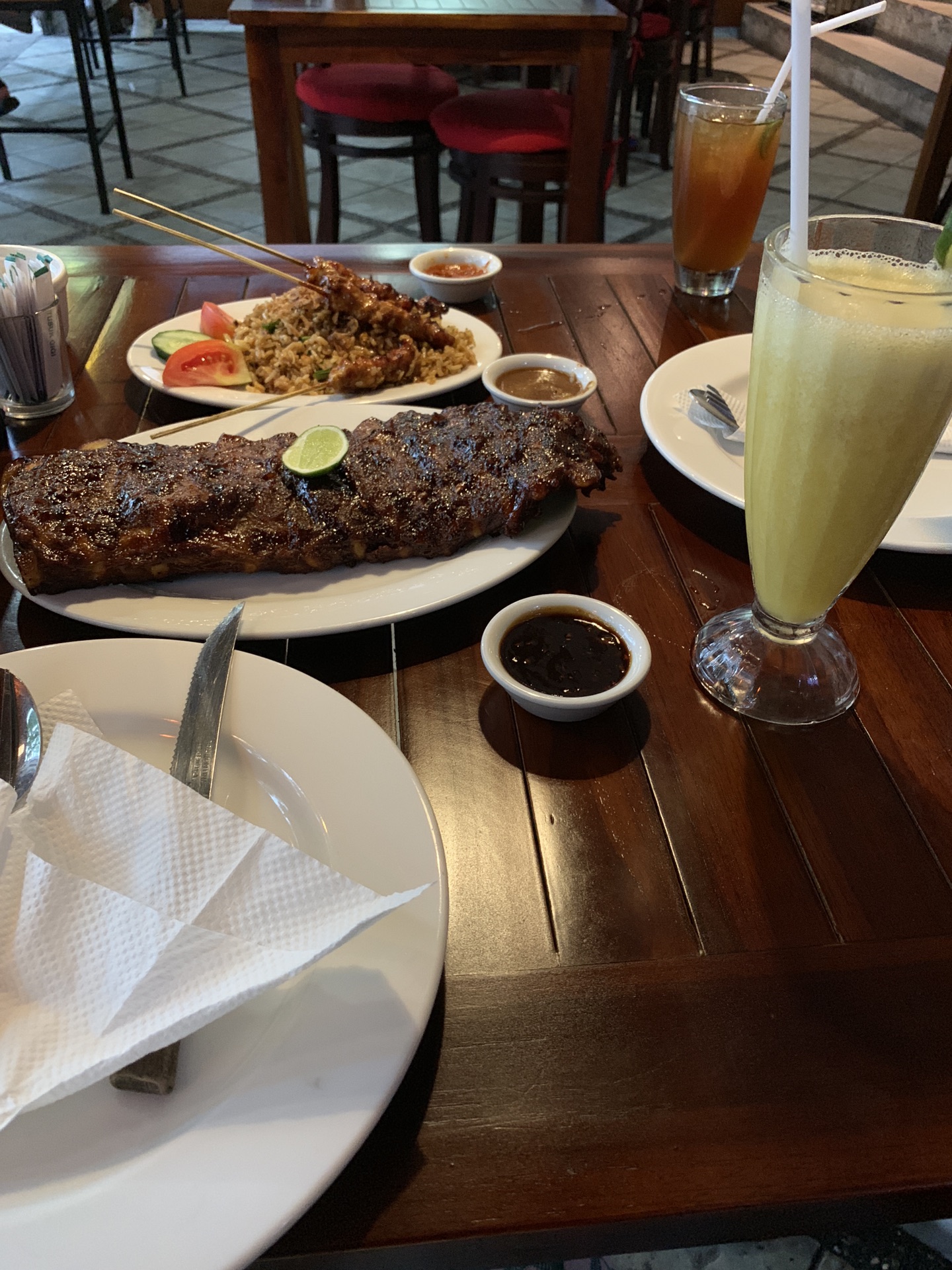 下午我们就呆在酒店休息,傍晚睡醒外出觅食。在TripAdvisor上看了酒店附近的一家猪排店,Warung chef Bagus。味道不错,甜甜的猪排酱,吃了人民币一百出头,吃肉撑饱。