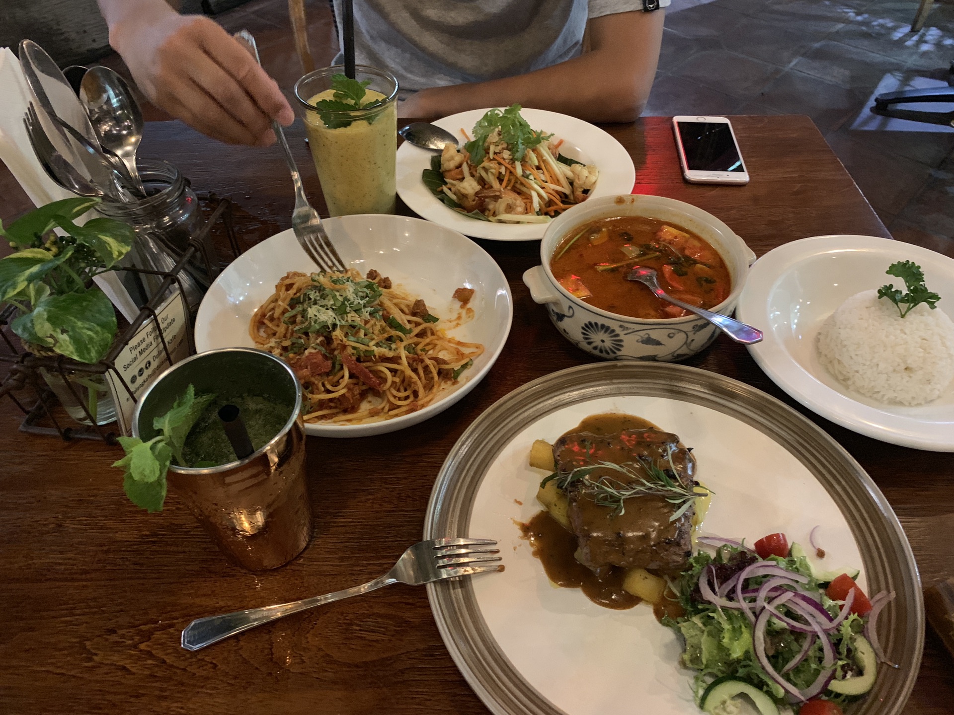 晚餐我们选择了库塔街上一家热闹的西餐厅叫Dulang restaurant,环境很好,有乐队现场弹唱,牛排和意面味道很棒,冬阴功和芒果虾沙拉味道一般,两杯果汁,加上服务费一共603K,推荐给喜欢西餐的小伙伴们。