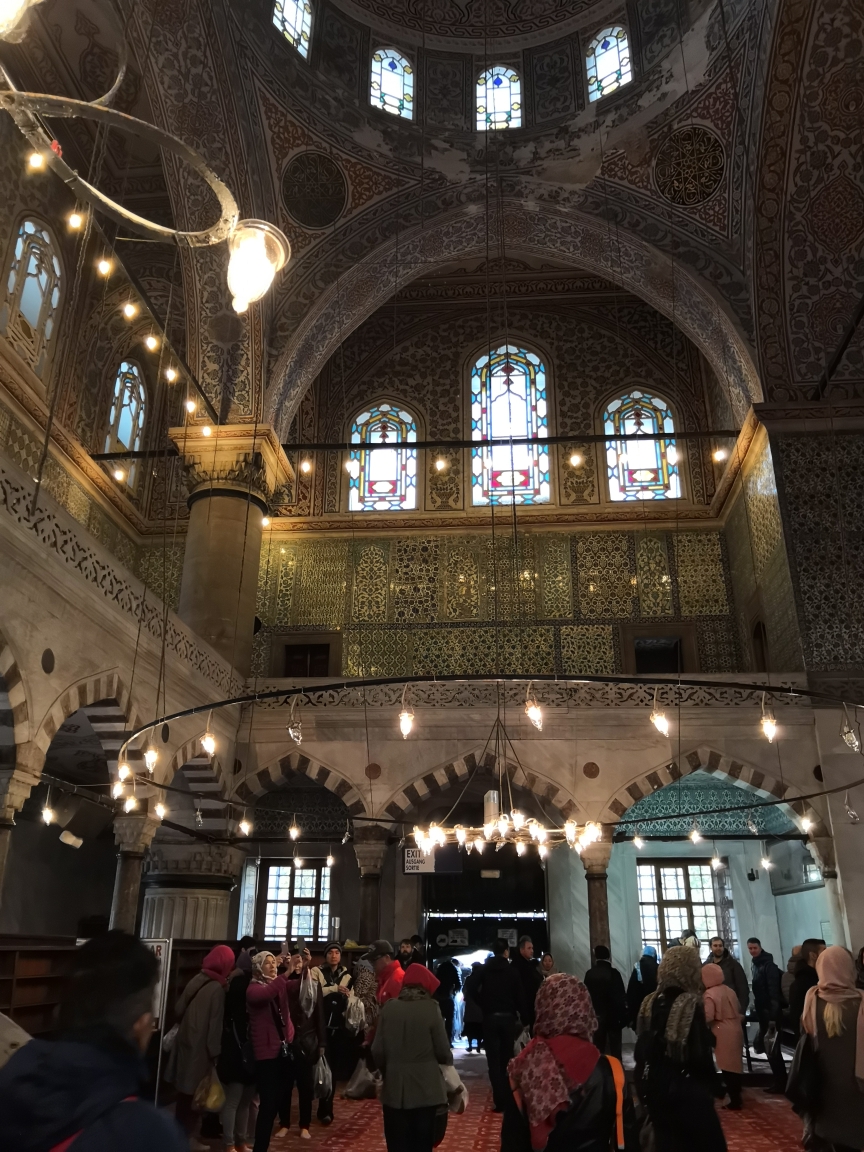 每天开放的时间是固定的,早上没有赶上,下午从大巴扎出来再次前往。 进门需要排队,鞋子套上塑料袋,里面对面好像是大理石的,铺上了地毯,也还是冰冰凉。
