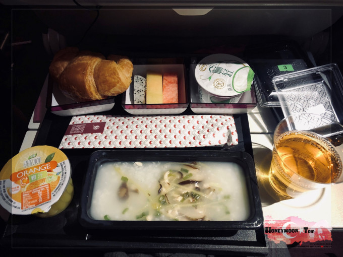 到了第二波飞机餐已经是早餐了,这次我们俩特意选了两种,粥套餐跟面条套餐