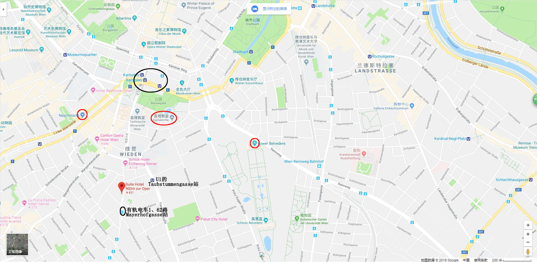 虽然从U1的那个地铁站都可以到达上图中画黑色大圈的地铁换乘点集中的卡尔广场区域,但从我们酒店出发去这个集中换乘的区域,最方便的办法其实是在酒店的斜对面坐有轨电车1路和62路(站名见上图),在Oper Karlsplatz站下,下车就是地铁站了。