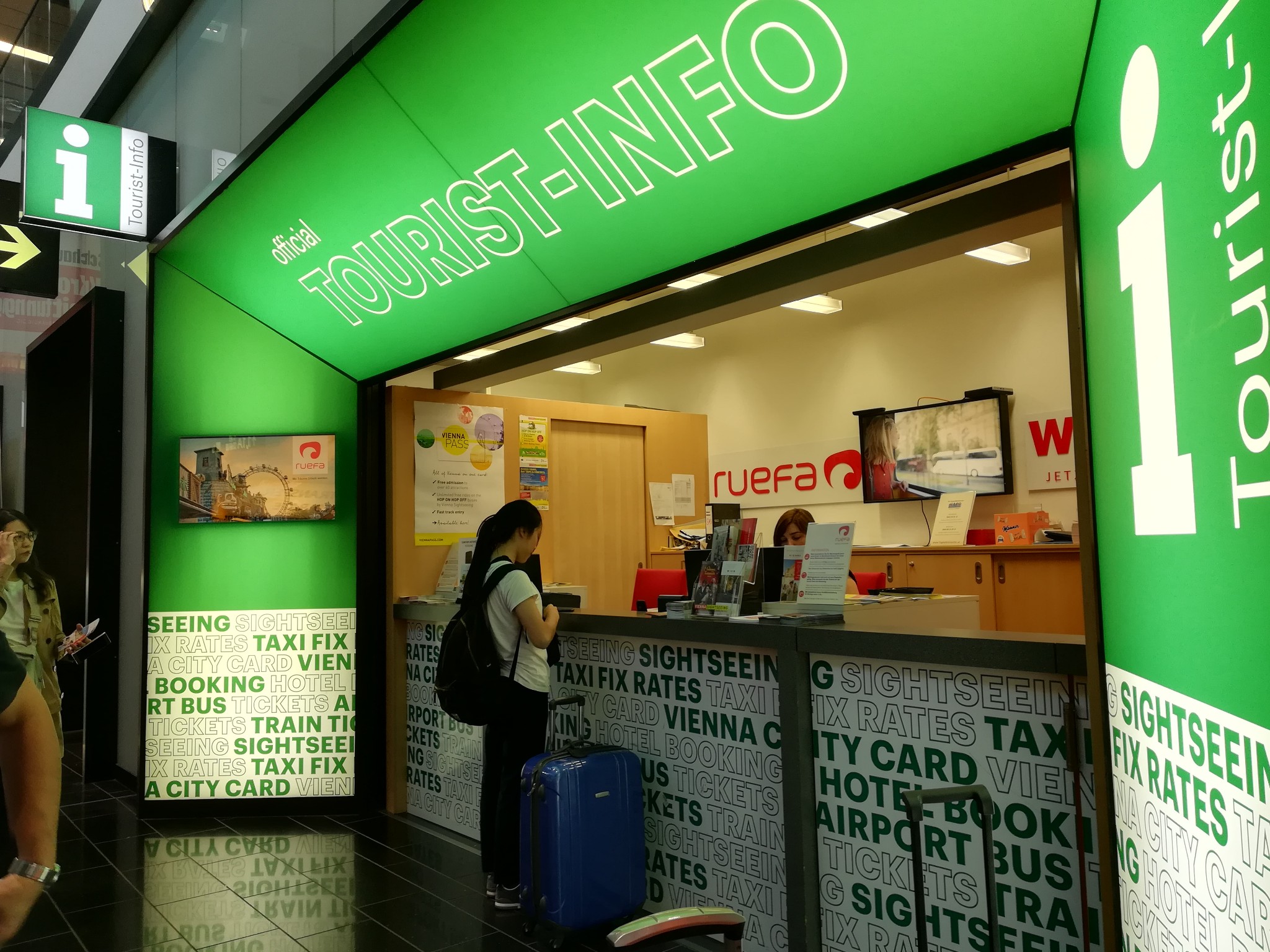 在出关后先调试好各种通讯设备,然后第一件事就是去买维也纳卡。关于什么是维也纳卡,各种使用tips,楼主都会放在最后的干货中讲,着急的就直接右边目录直达。维也纳机场售卖维也纳卡的地方在下图这个绿色的咨询处。