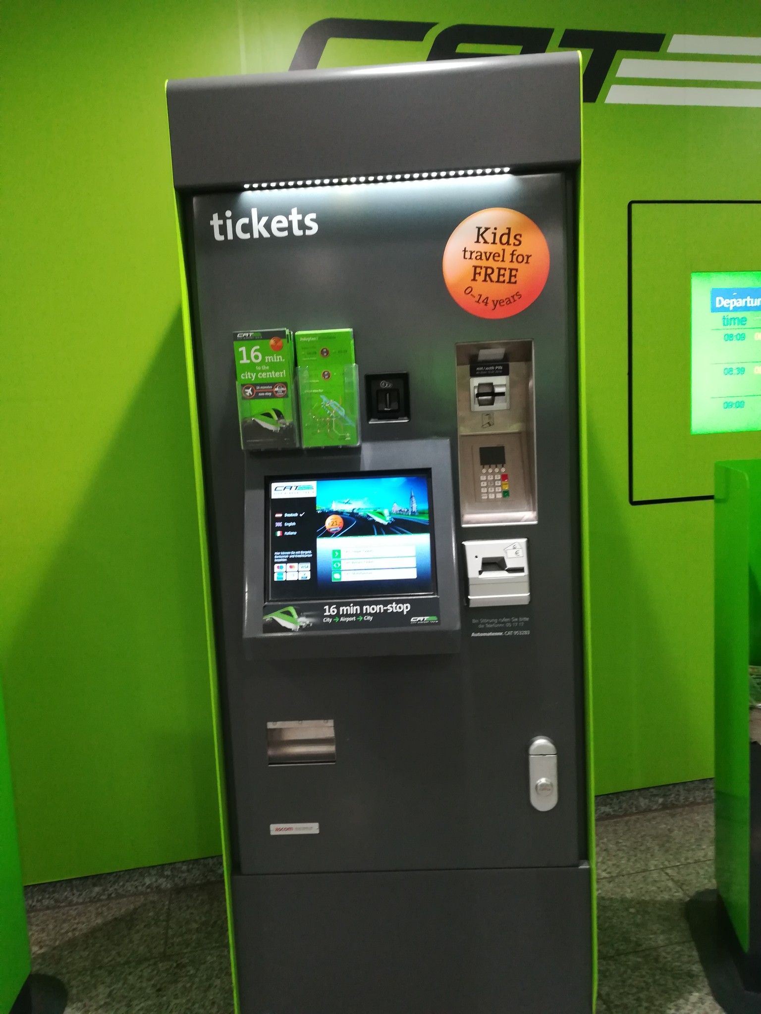 下图是CAT的自动售票机,界面和操作都很好理解的(此行真正最考验人的是慕尼黑交通的售票机,后文详述),只不过我们俩的磁条卡都刷不出来,最后只好现金支付(此处庆幸幸好手上的欧元都是小面额的)。