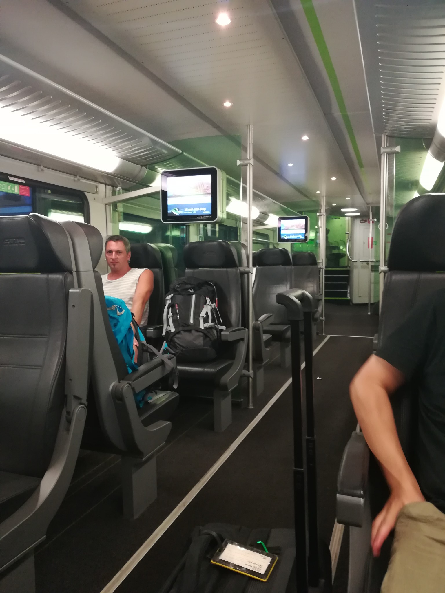 维也纳机场去往CAT的站点很容易,一路只要顺着上图售票机后面的绿色标志走就行了。CAT快线是双层的,上车后,会有人查票。