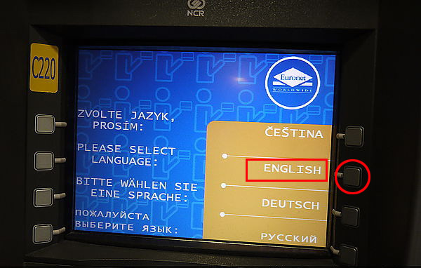 给你们看个ATM机的图呗(有银联标志就能用),选择英文操作很简单啦,初中英文水平都够了不用惊慌失措随意发挥就行