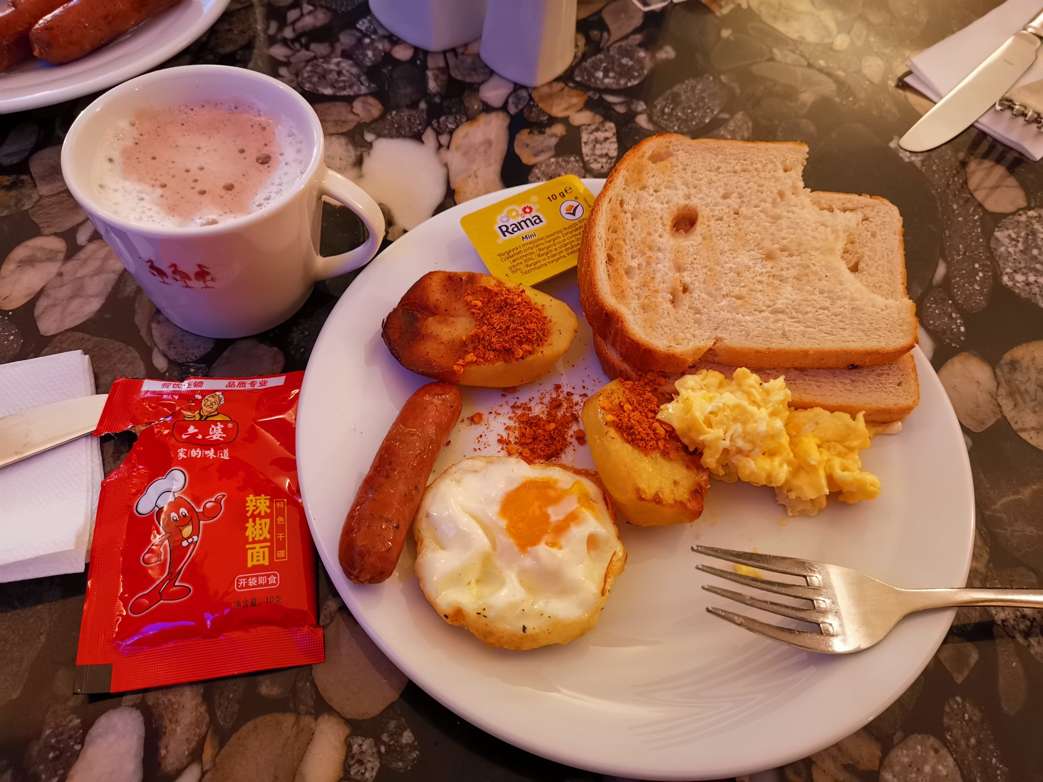 因为到酒店太早了,酒店服务人员给我们准备了咖啡还有给小朋友的牛奶和热水,告知我们到了07:00我们还可以去餐厅用早饭(原本是没有这顿早饭的,免费送的要不要这么好)这个酒店国人定的应该不多,没有看到过中国人比较冷门吧,但是从服务和热情度来说都很不错哟(欧洲酒店通病三天早饭都一一模一样,这个时候我说要带的六婆你拿不拿出来哈哈哈哈)