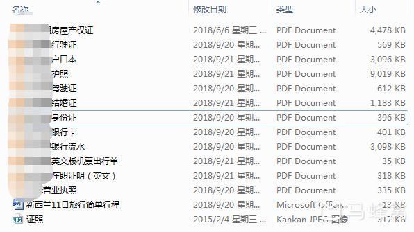 !你需要准备的材料有:JPG格式的证件照片,PDF格式的护照扫描件、身份证、户口本、英文版机票出行单(证明您是一个真诚的人 & 您已经购买了返程机票)、英文版在职证明(您雇主的准假信)、半年的银行流水、其他辅助证明资产的材料(房产、汽车产权证,股票、基金等权证)等。下面的截图,是我办理电子签证的文件,照着准备就可以了。