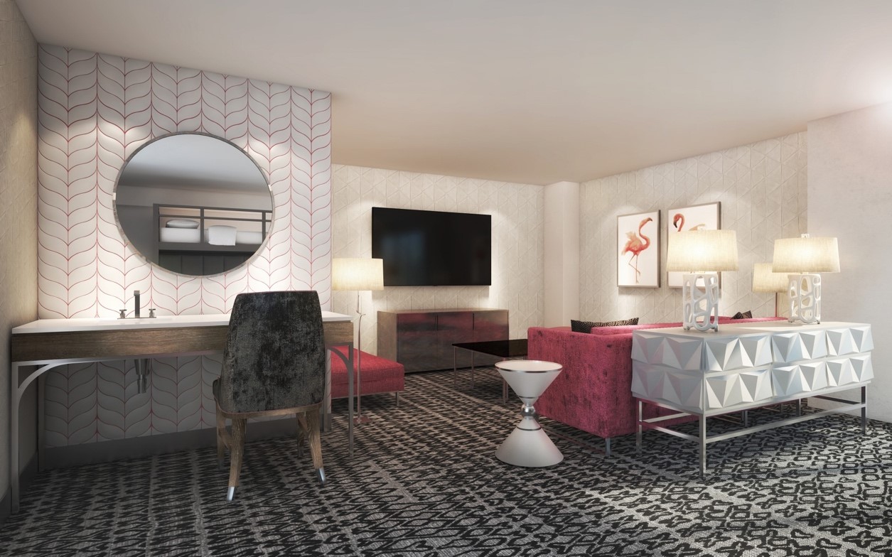 全新装修的红鹤酒店客房以红鹤粉和活波的淡金色调创造出充满当代艺术感的氛围,同时又展示出维加斯现存最早的酒店丰富的历史。