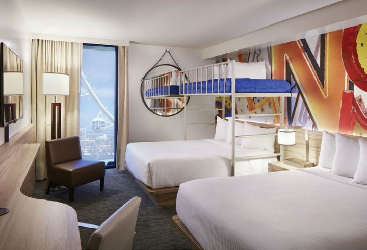30平米的上下铺豪华房配有两张双人床和一张上铺单人床,可供五人入住。酒店位于维加斯大道的核心地带,地理位置、舒适度和性价比让这里同样是不错的选择。