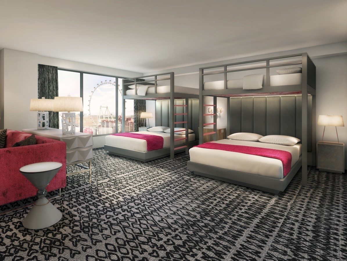 近100平米的上下铺套房集欢乐、时髦和舒适与一体,适合家庭、好友出行。在房间里你可以来上一场家庭聚会或者好友派对,在维加斯酒店房间也能让你玩上一整天。