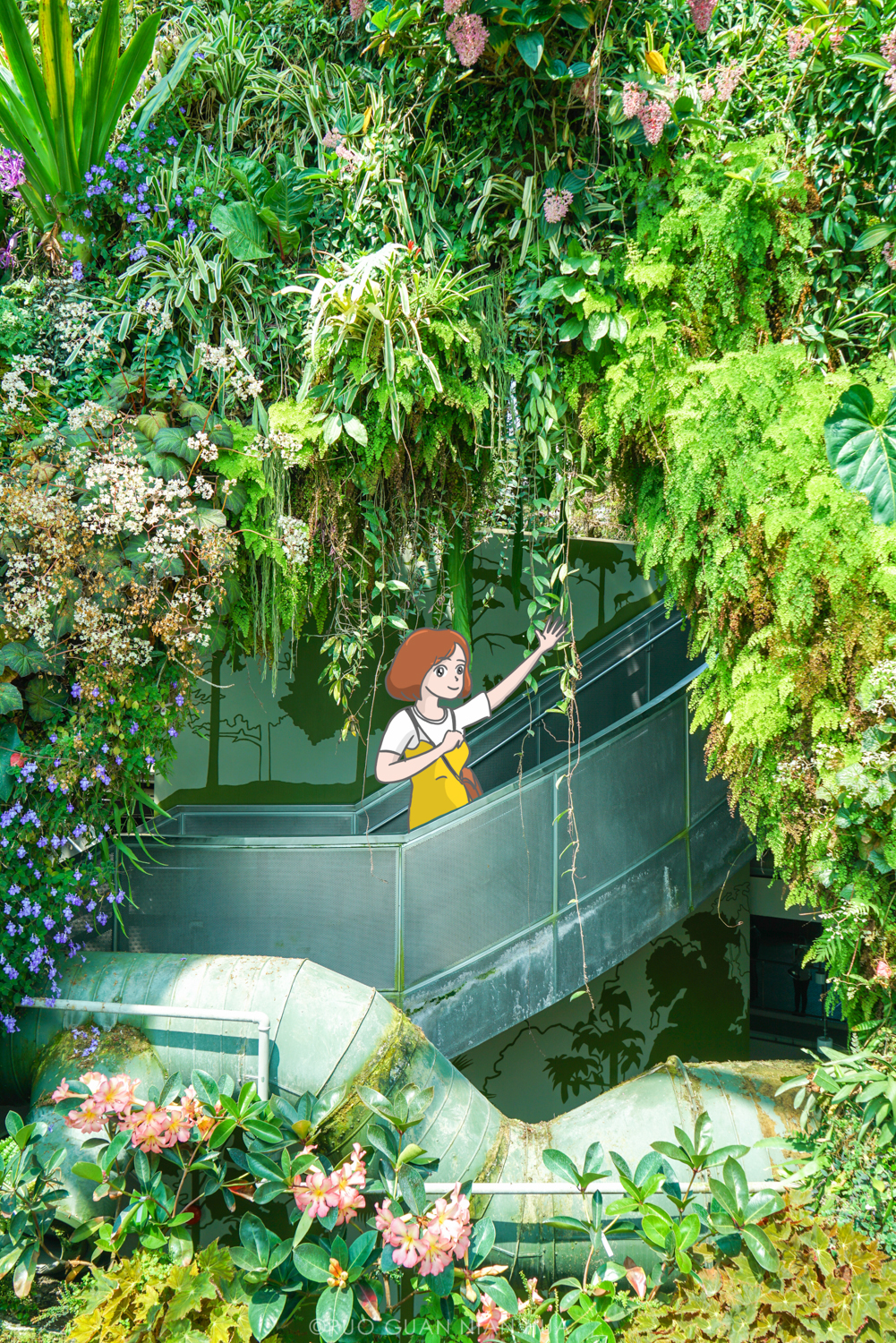 一路沿着云雾廊道漫步而下,被各种绿色植被包围着,明明还在城市中央,却像是身处丛林。这时候正好遇到整点喷雾,有种自己在云端漫步的感觉。