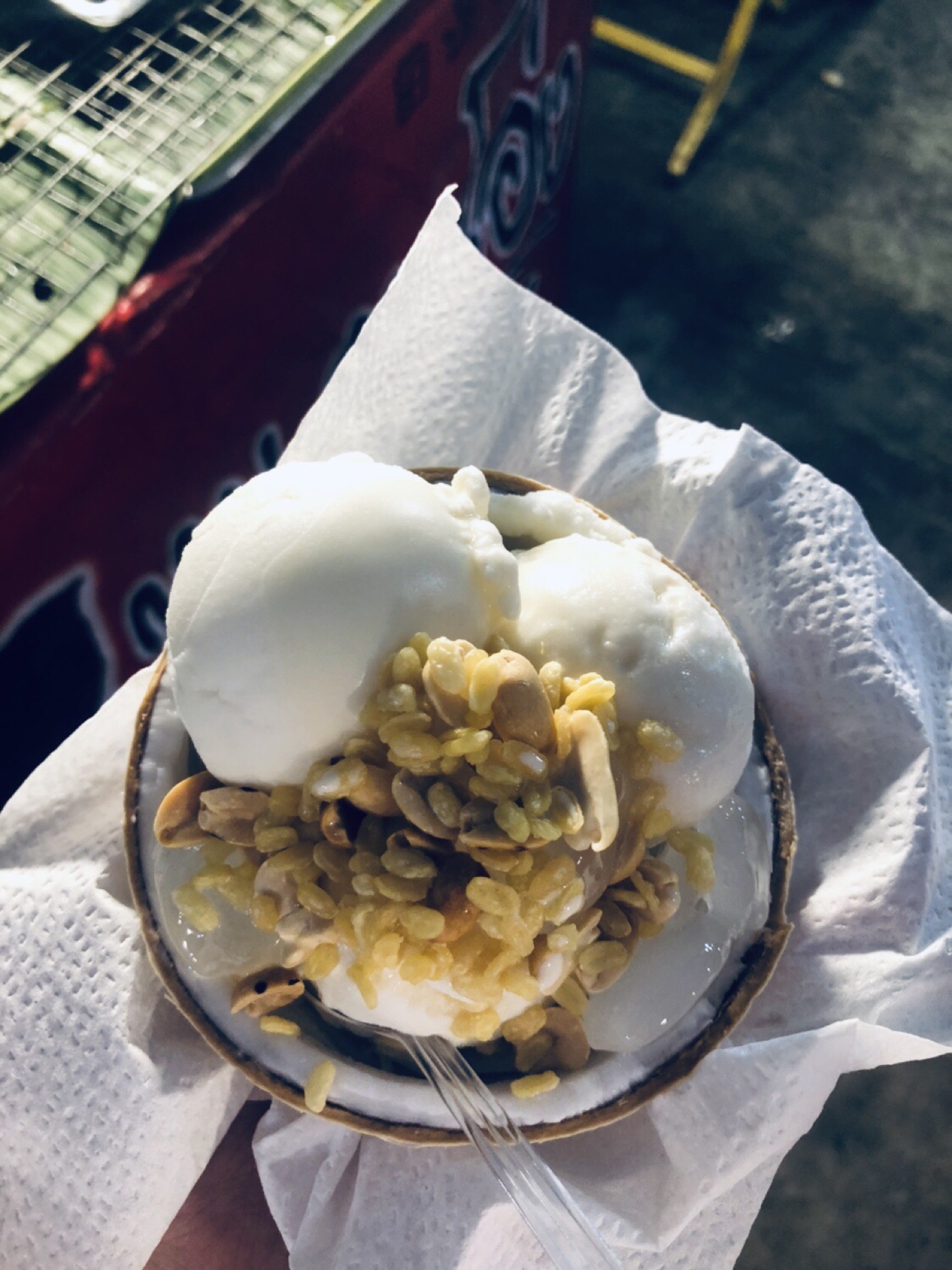 椰子冰淇淋(40铢)。小哥做这个椰子雪糕的时候居然把里面的椰汁全部倒掉了!!太可惜了。