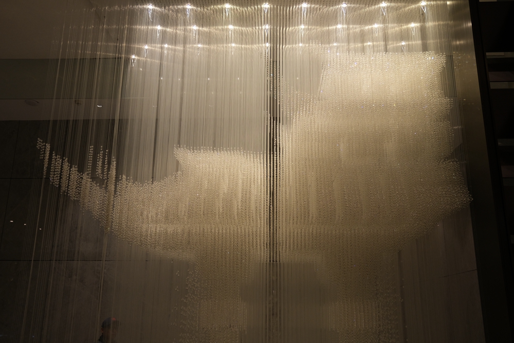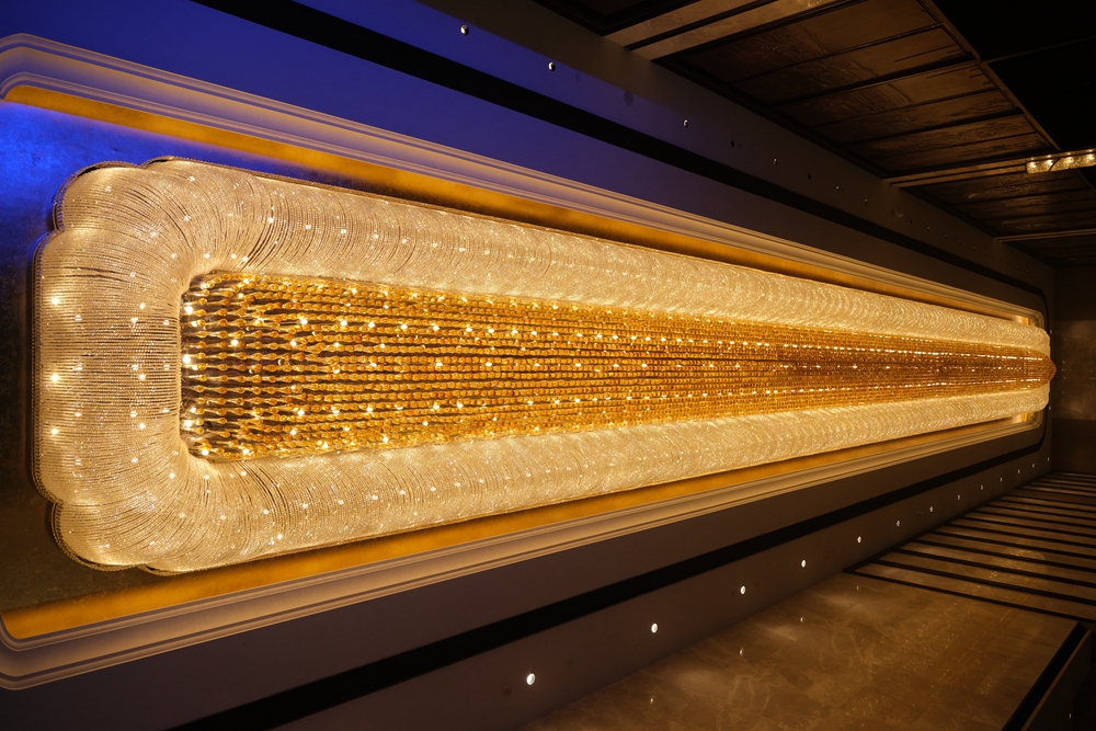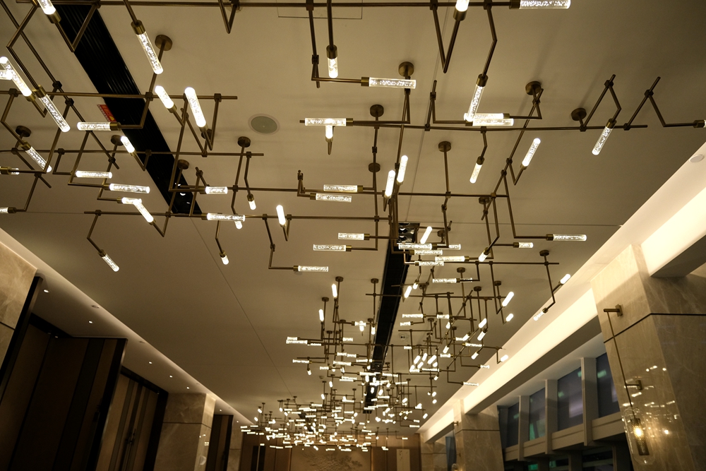 整个大堂的空间宽敞明亮,而且色彩以暖色调为主,包括三楼的宴会厅、四楼的中餐厅,均是这种风格,在暖光灯的照耀下,烘托出一种温暖柔和的感觉。我去三楼闲逛的时候,巧遇某家大公司正在它的大宴会厅举办年会。话说天元大宴会厅到的面积还真不小,足足有1008平方米,走廊上的吊顶灯也相当的高大上。