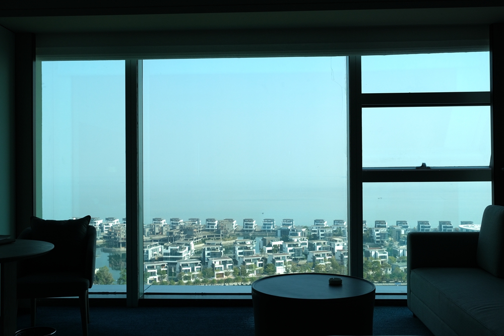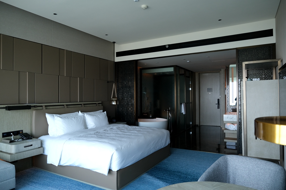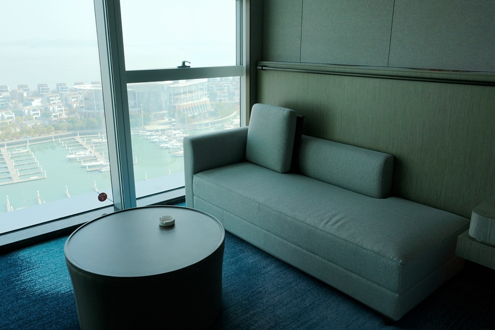 厦门天元酒店一共拥有348间豪华客房及套房,而且绝大多数都是海景房,我入住的是行政海景大床房,它的面积达到了44平方米。推门一进房间,第一眼就能透过落地玻璃窗看到蓝色的大海,这让我这个爱海之人雀跃不已。走进房间,茶几上还摆放了酒店精心准备的小甜点,真是让我感到酒店的体贴之处。