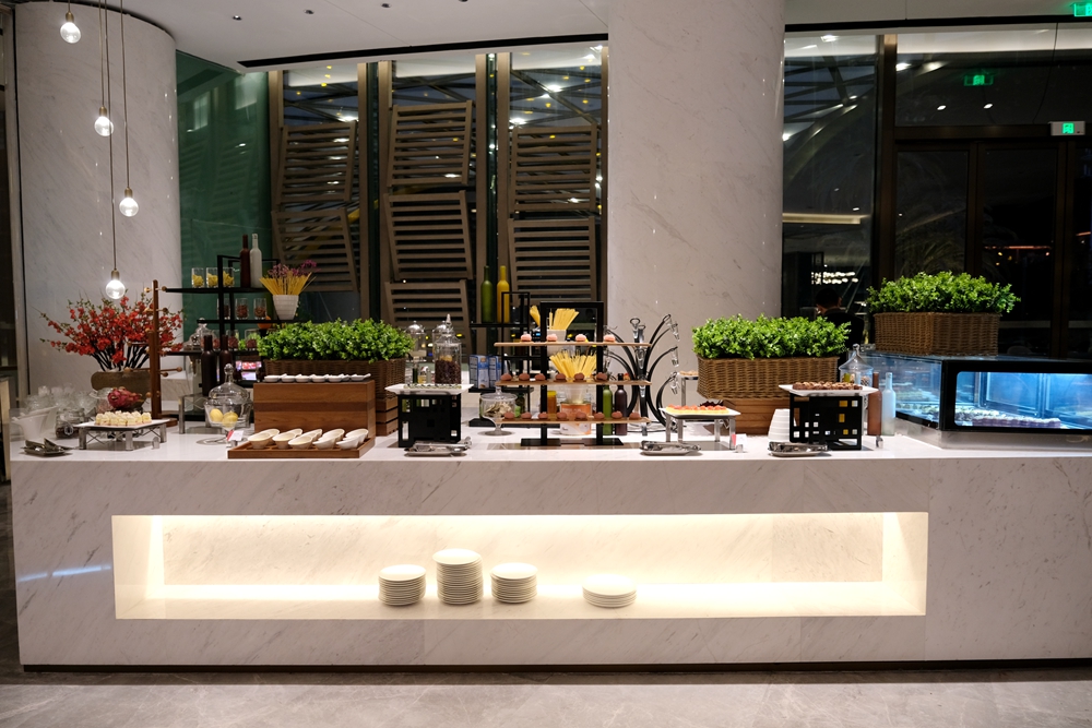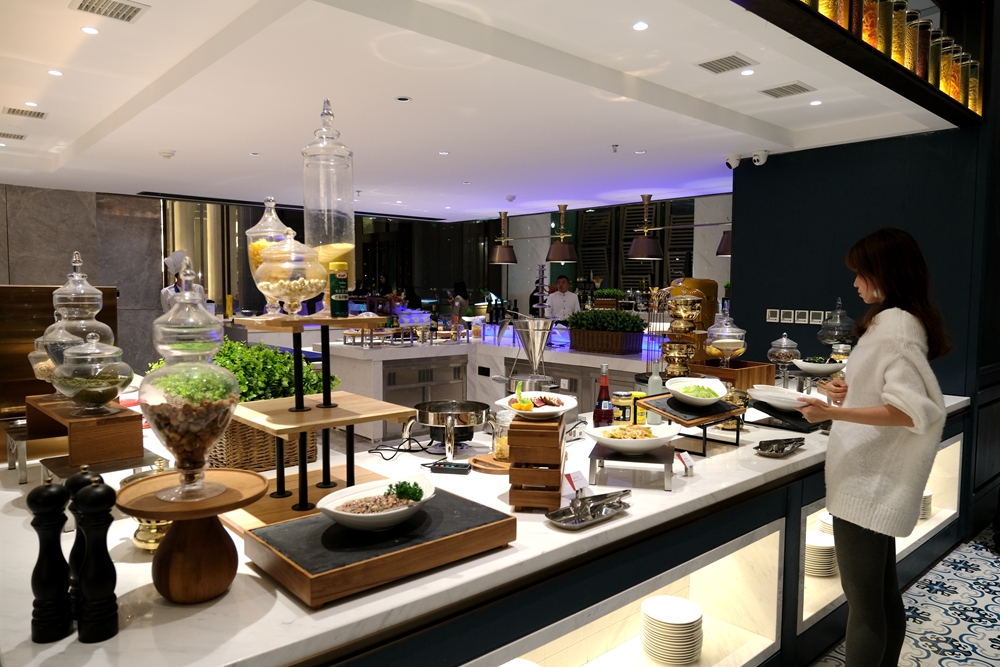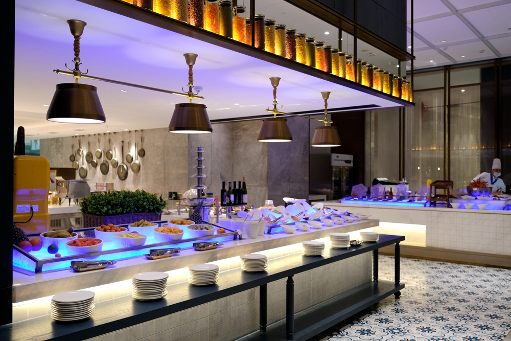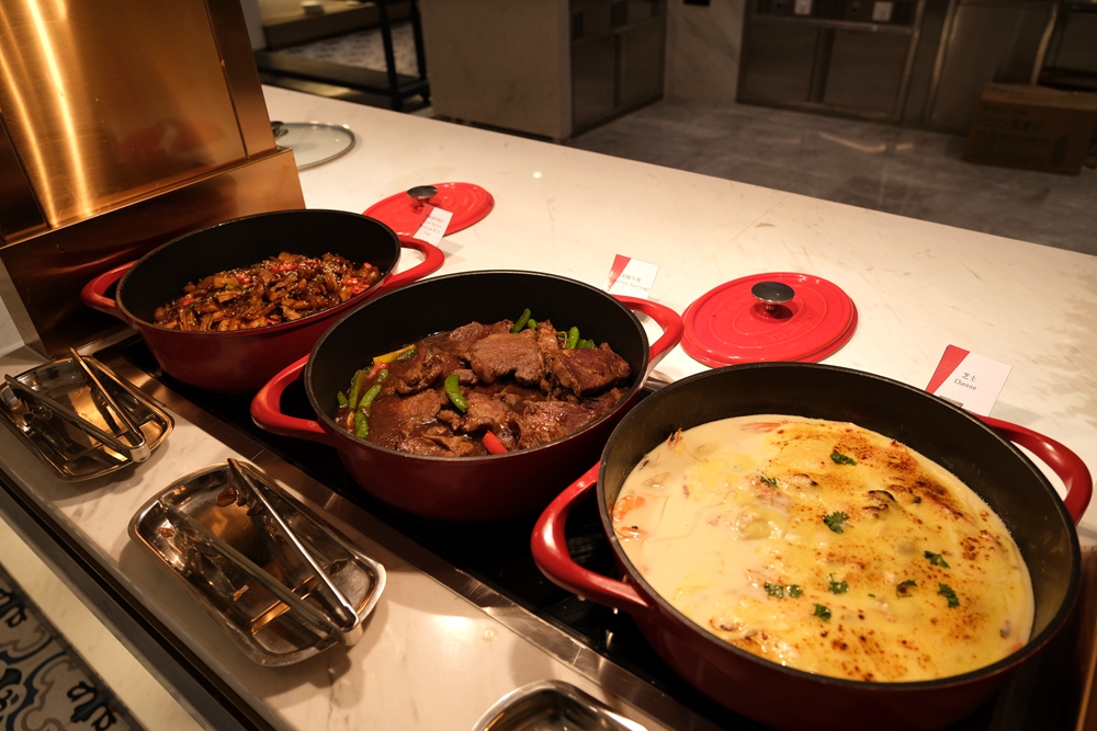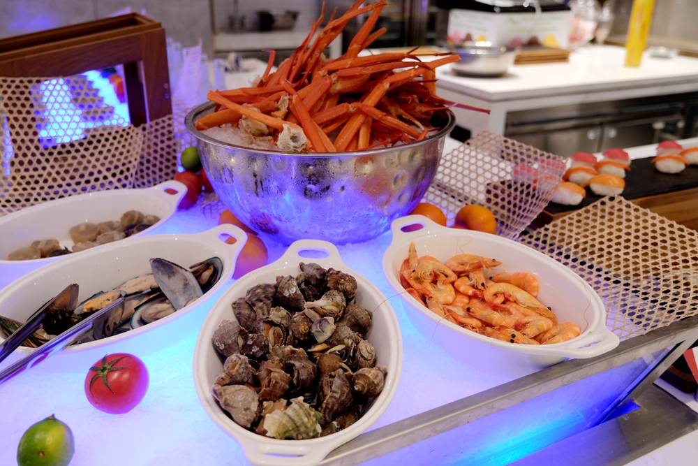 酒店新开张,目前自助餐每位需要188元,酒店为每个用餐者都准备了半只蒜香波士顿龙虾和自助海鲜火锅,轻轻松松就吃回本了。我是第一次品尝自助海鲜火锅,吃起来也很意思,因为想吃什么海鲜,自己去自助餐餐厅活水池的挑选。这活水池将鲍鱼、海虾、虾姑、海螺等海产品先清洗再放养,如此一来可以保证食材的鲜度。
