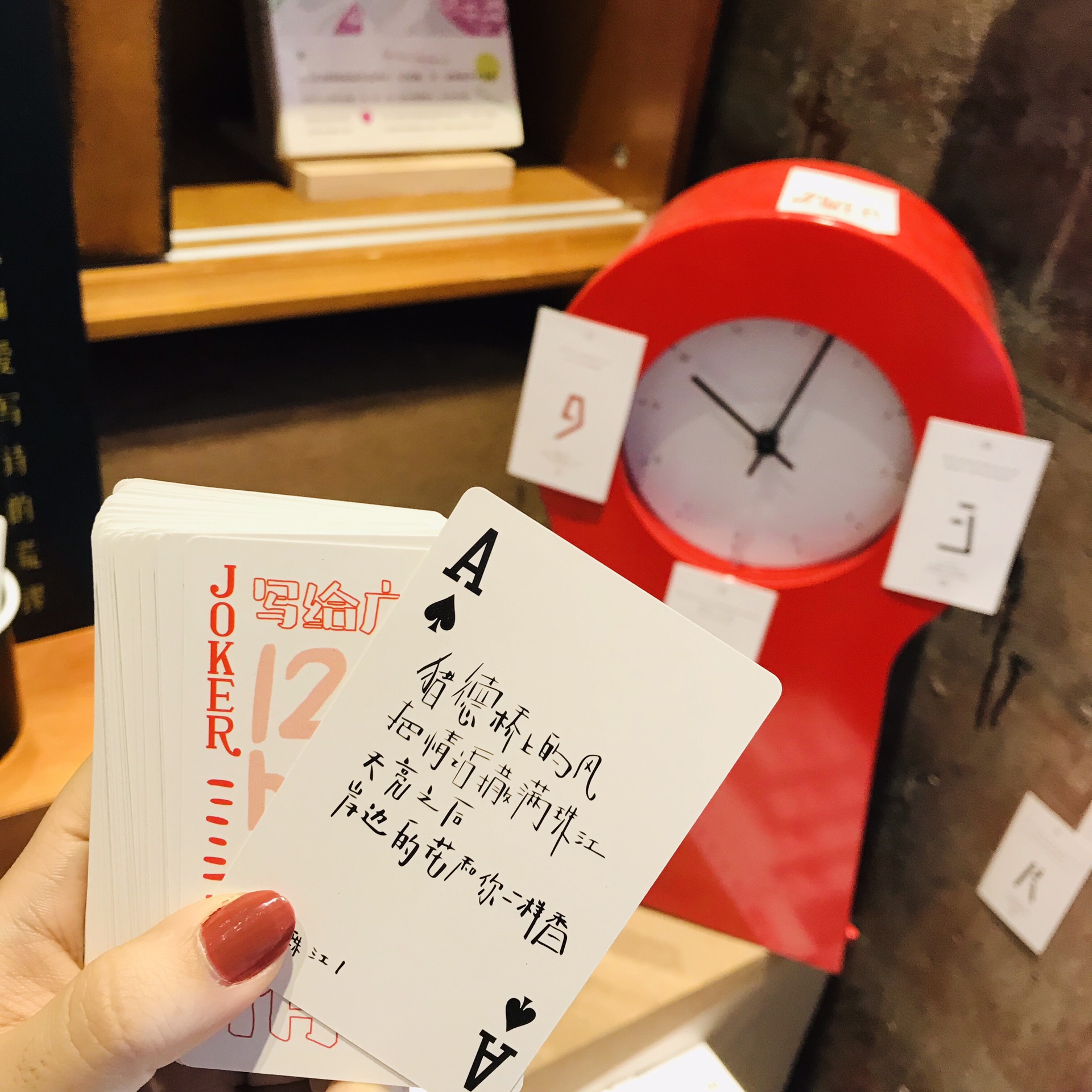 这家书店里有一些小创意很有意思,我们买了一副牌,每张牌上都是广州出名景点的一句话。