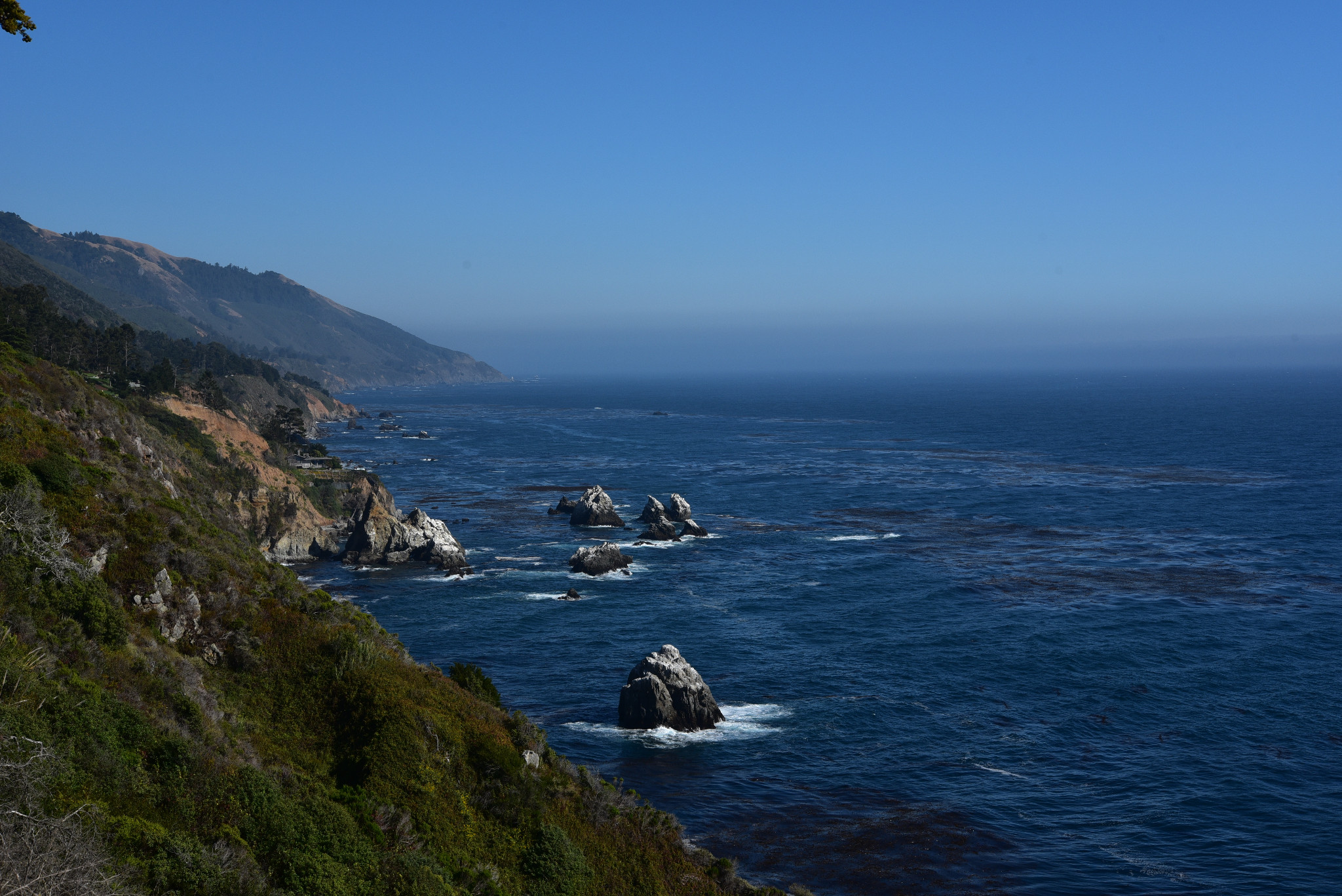 大约中午的样子,我们来到了这一路的著名景点-大苏尔。这里正好是一个小的海湾,碧蓝的海水、白色的海浪、金色的海滩、岸边参天而立的大树、盛开的一丛丛野花,这场景真是让人心旷神怡!陶醉其中!我们在大苏尔一带足足停留了一个小时,才依依不舍地往前赶路。