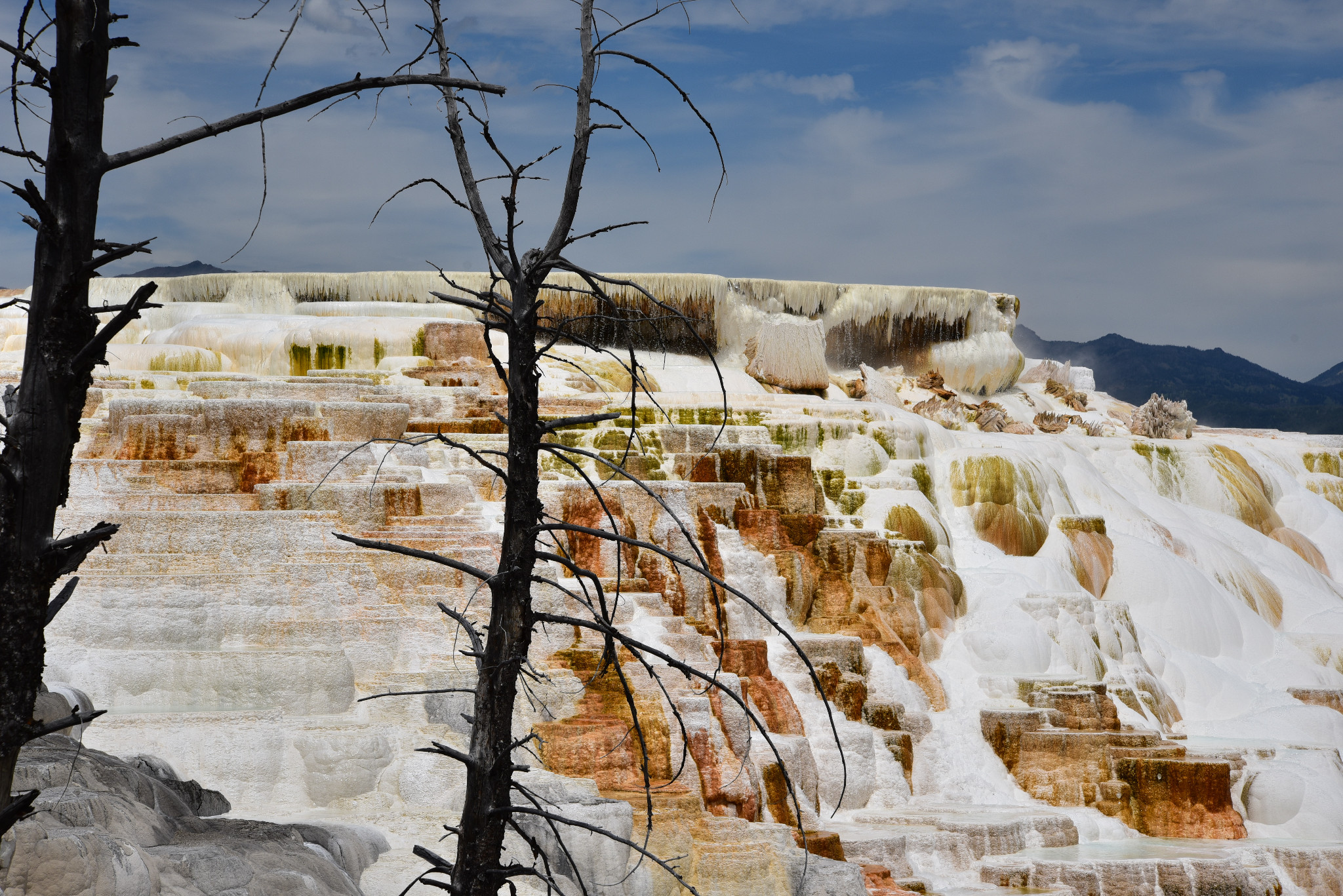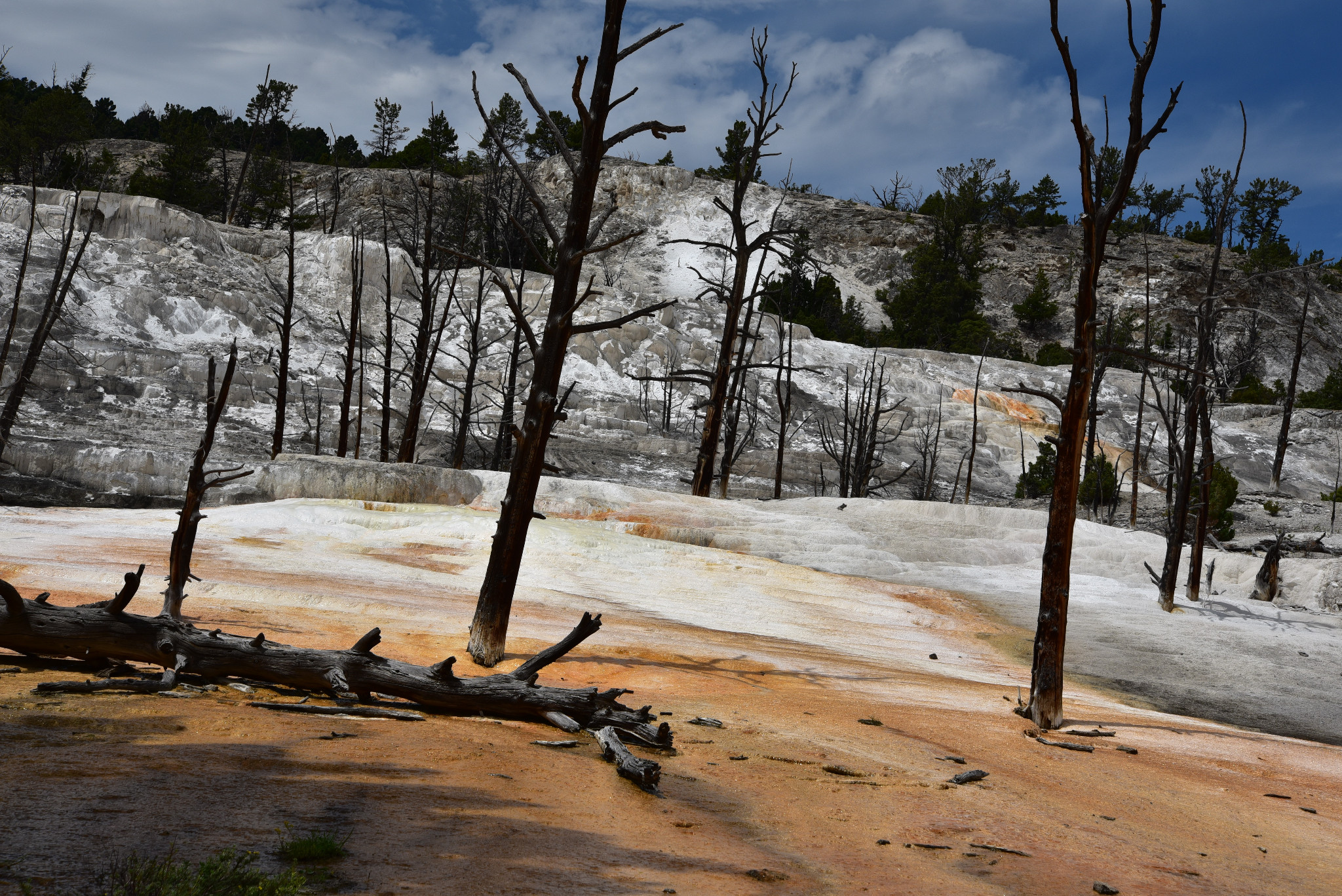 离开吉本瀑布,开车奔往北半圈上的主要景区-猛犸象热温泉景区。还有约50公里。我们在这段路上行驶途中才发现车子的油量有些紧张了,毕竟从盐湖城出来后一路上都还没有加过油呢。沿途上其实还有诸如比利湖、天鹅湖、金门等十分漂亮的景色,但心里惦记着油的事,基本上光顾着赶路,都没怎么停车赏景了,因为从景区地图上看似乎猛犸象热泉景区有加油站,一心就想着赶快到那里把油加上,心里才会踏实。结果到了猛犸象热泉景区没有发现有加油站,而油量指针已经指向红色区域的底部了,真担心被搁在路上,心里那个急啊。急归急,到了这个主要景区还得玩啊。停好车后,先就在车里把午餐饭解决了,还多亏昨天在沃尔玛买的那么多备用食品。吃了简单的午餐后,我们就沿着景区的步道游览。这片景区是在一个大斜山坡,分为上台地和下台地两部分。我们的车就停在上台地入口处停车场,游览过程基本上是沿步道往下走。在上台地,主要分布的是一片又一片的硫化岩土,或白或黄,其间有大量的树木被含硫土壤侵蚀后显现出十分怪异的景象。出于好奇,恨不得离得近一些看个究竟。