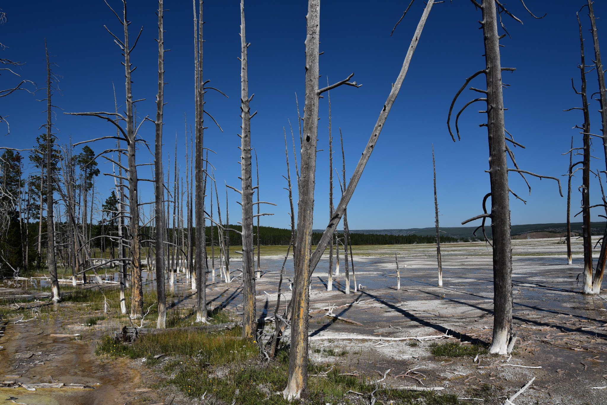 手机导航的地点是老忠实泉。 路途中,远远就看见热泉在往上喷,喷得很高,没等走近就停车拍照,等走到了后才发现不是老忠实泉,是大间歇泉,不过确实神奇,一个一个的泉不断地冒着热气,水咕嘟咕嘟像开水一样在沸腾,有一处的是泥浆也在咕嘟咕嘟的沸腾。核心处的大热泉不断的往上喷,高度达到10米,它的边上还有几个热泉,此起彼伏的喷发声不断,周围都是热雾茫茫。整个大间歇泉区域内有很多已经枯死掉的树木,加上热泉区域白色的砂石颜色,其景象显得有点诡异。
