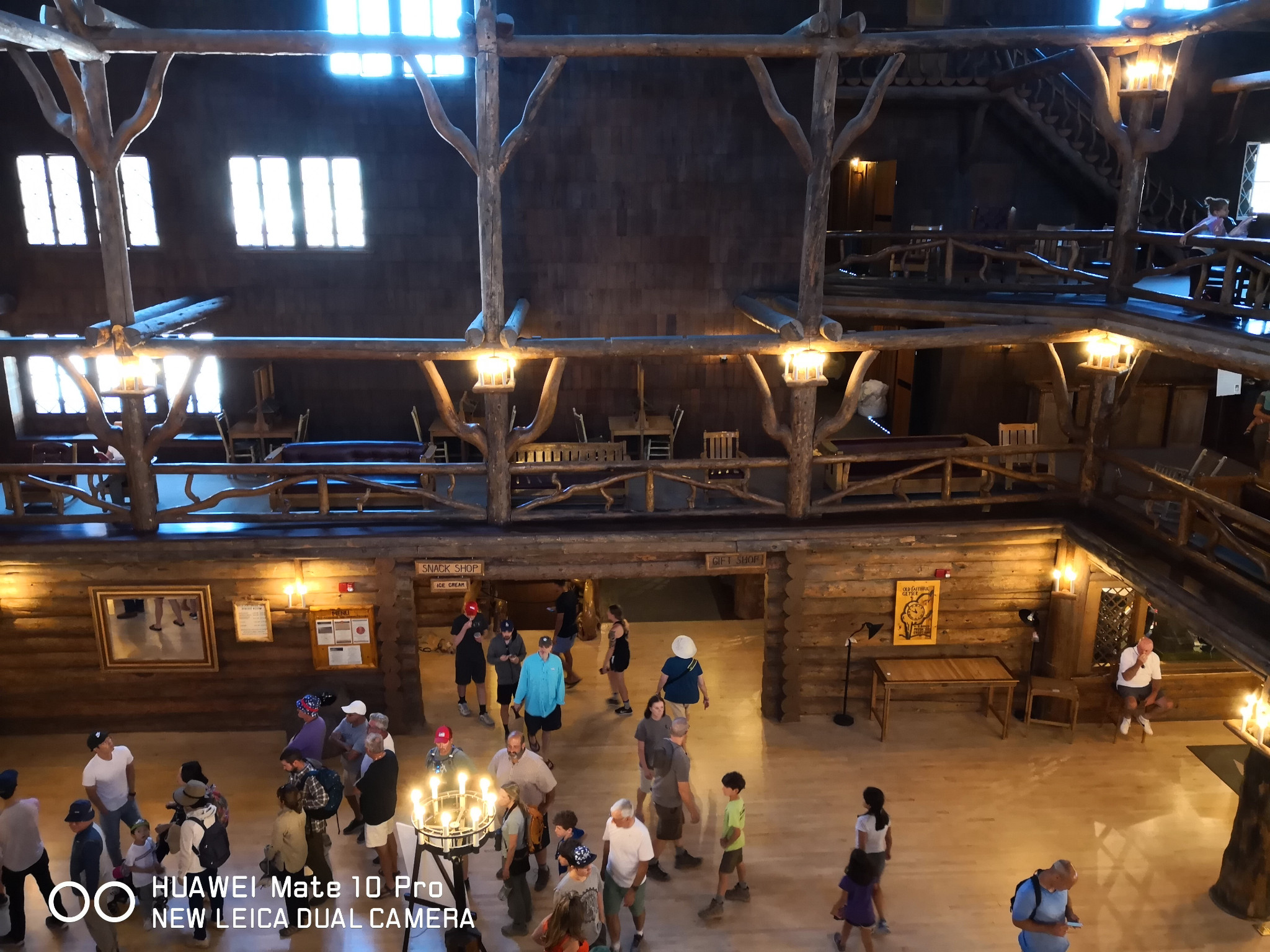 离开大棱镜热泉,我们又差不多行驶了20多公里才到了老忠实泉景区,这个景区一看完全不一样,除了超大的停车场外,服务设施非常齐备,酒店、购物、饭馆、娱乐设施样样齐全。我们先是来到景区中最大的建筑群-老忠实酒店,走进后发现酒店大厅全部由整木构建,中央还有大天井,上下共五层楼,很有特点,也有历史,到这个景区来的游客几乎都会来这酒店观光、吃喝、憩息、玩乐、购物。
