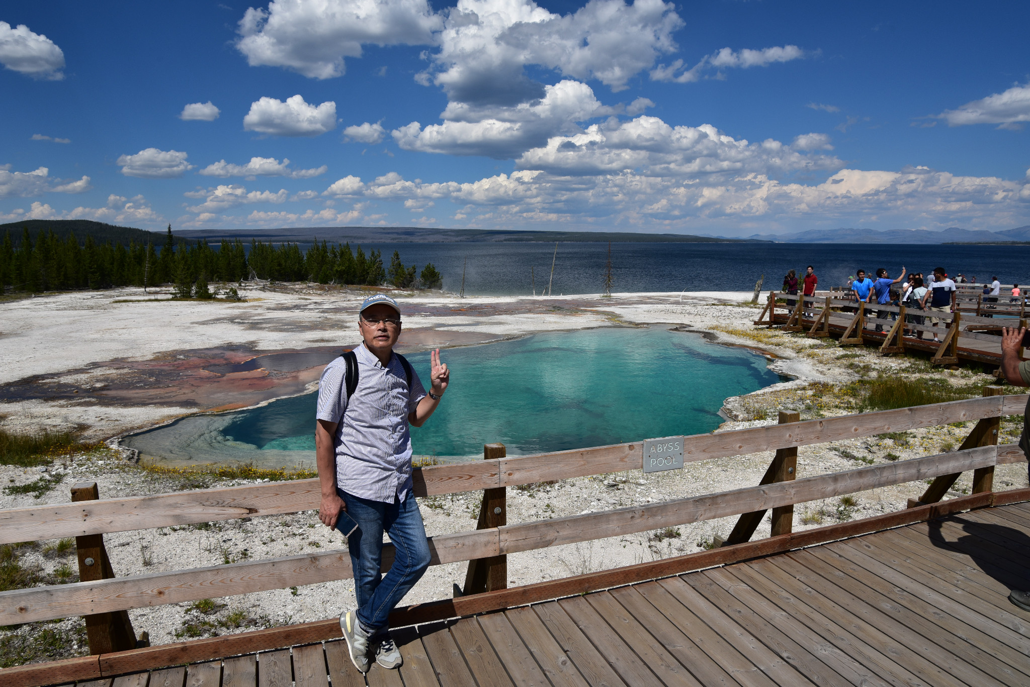 我们驱车往黄石湖方向走,差不多又行驶了30公里,来到黄石湖湖边的西姆指,这里是黄石公园南半圈最南边的一个景点。停好车后,我们就径直来到水边,湖面很大,我们能看见的只是其很小的一部分。湖水很清澈,沿着水边栈道一路行进,时不时地能看到从水底有热泉从泉眼里不断地往上涌,据说有海獭冬天就猫在这样的泉眼中过冬,我们还居然看有蛇在湖里面游动。我们顺着栈道来到湖岸边的一片开阔区域,只见岸边有一大的热泉池,水十分清澈,池的中央呈现出碧蓝色,隐约可以看见底下还有溶洞,热泉在不断地在往外涌。站上热泉池边的观景台,远处有雪山,蓝天白云映在湖面上,湖面上还有人划浆疾驰而过,近处是大大小小的热泉池,有碧蓝,也有黄色,地面上的沙土被热泉浸润后也是五彩缤纷,一个梦幻般的境地!站在这里,虽然头上的太阳很大,但温度不高,湖面凉风习习,感觉很舒服,享受了。
