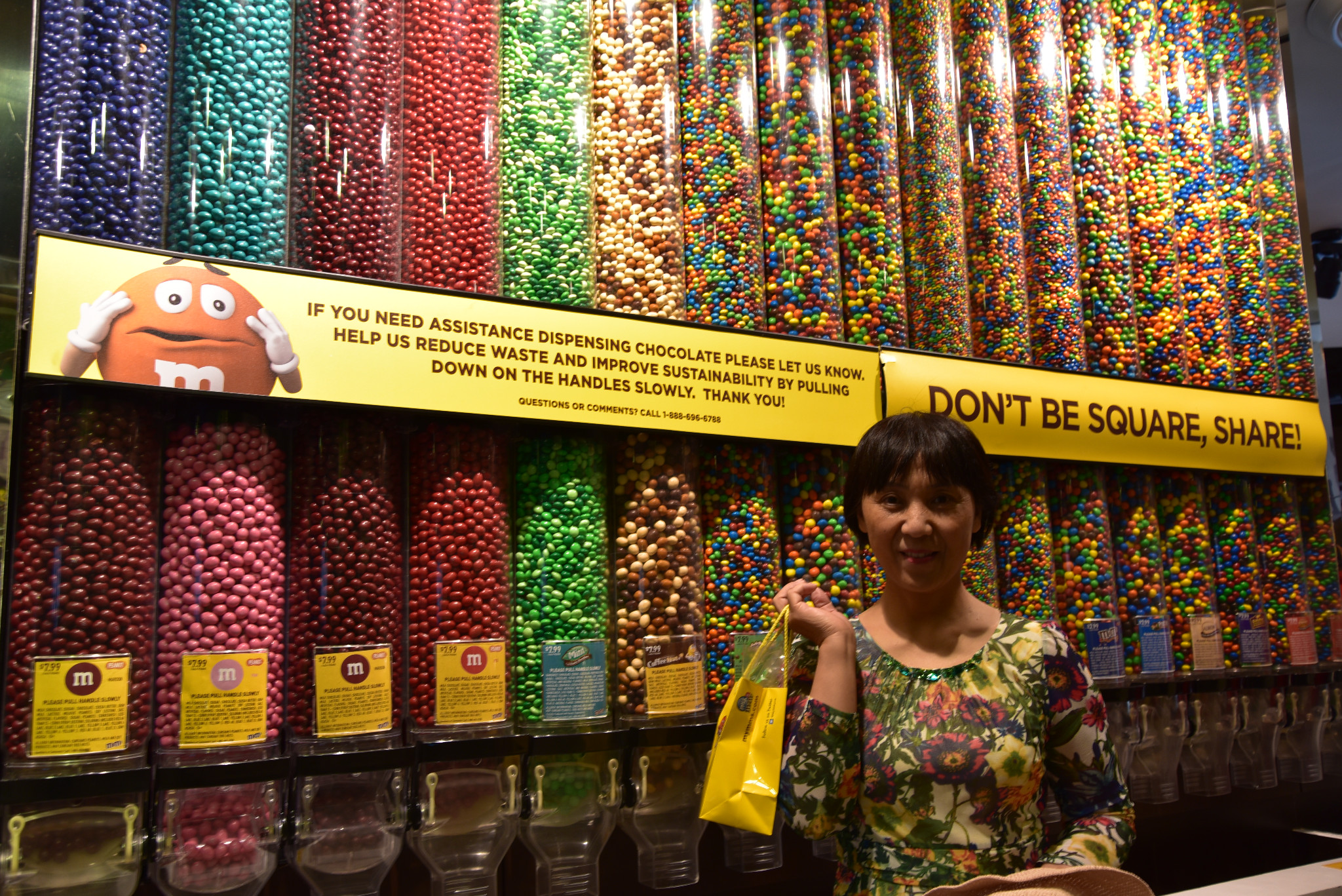 早上吃过早餐约8点半,我们乘地铁M线前往曼哈顿中城,先来到时报广场,哇塞,这一带的街面上全是大得炫目的广告显示屏,也看到了我们国内知名企业的广告屏,来到这里能感受到全球经济跳动的脉搏,纳斯达克指数的显示屏在不停地翻滚。老婆在时报广场附近还看到M&M 豆的总店,赶快进去,她就喜欢这些花花绿绿的精致食品,上到二楼买了一大包所谓自己定制的彩色巧克力豆,关键是认老婆为比国内买的好吃,还很便宜!