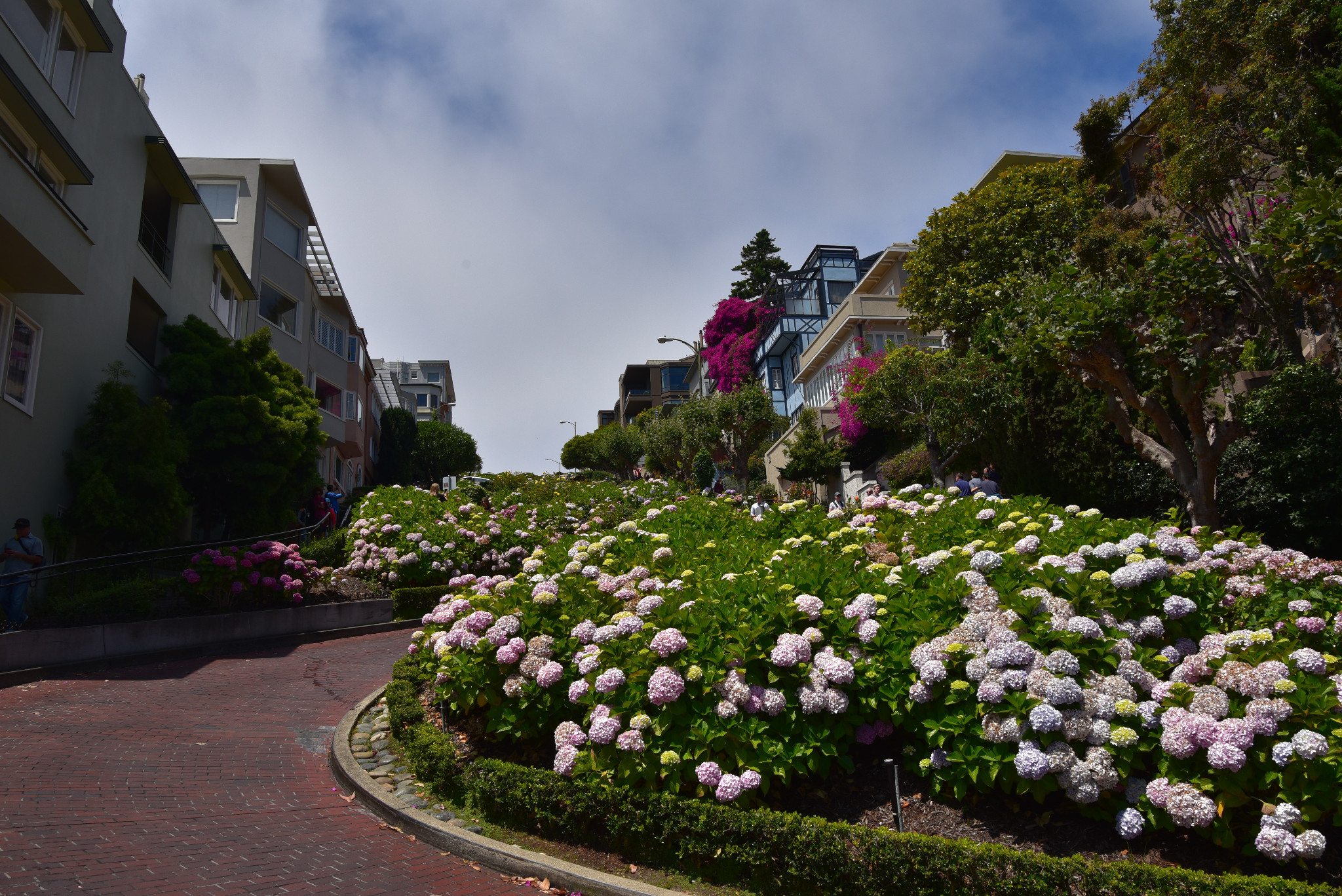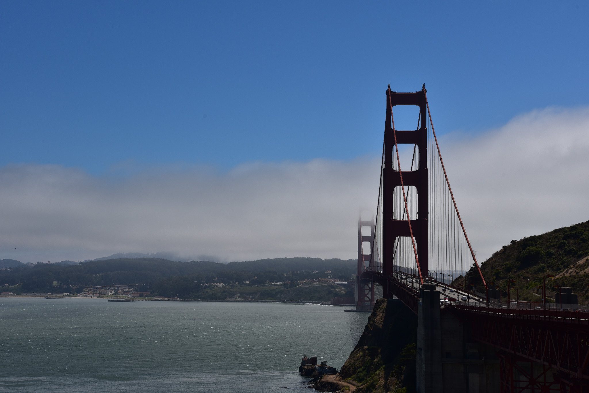 离开九曲花径前往不远处的渔人码头,可能是天气的原因,在那里看到的海狮感觉不是很多,老婆觉得海狮的味道太重,在那里没有待多大一会儿就离开了。然后我们前往金门大桥。到了金门大桥,本想在市区这边桥头附近找个地点停车,找来找去没有空的停车位,于是干脆就驾车过桥。在对岸桥头有一个大的停车场兼观景台,在这里我们也是好不容易才找到一个停车位。这里隔着不宽的海峡看旧金山市区倒是绝佳的位置,但天空似乎有些雾霾,拍照也不是很理想。再看金门大桥,的确是很宏伟壮观,但这个位置看过去几乎是顺着大桥方向的,角度不是十分的好。在我们驾车再过桥返回旧金山市区时,才发现过这大桥是单向收费,而且是电子眼拍照按照车牌收费,由于我们是租赁车,缴费比较麻烦。看来还是来之前的功课没有做好,关键是后面接着还有坑啊。先不管这些烦心事,出来旅游嘛还是开心最重要啦!