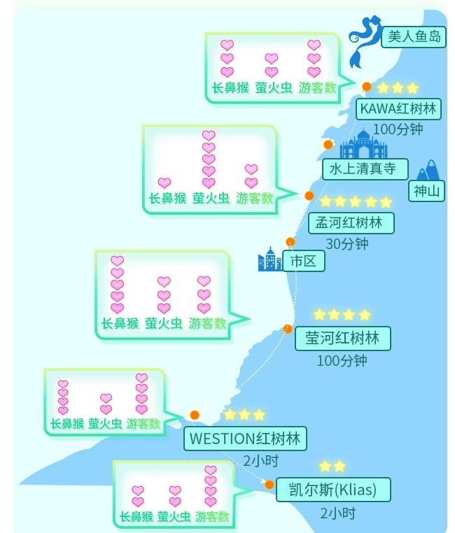 亚庇红树林主要有莹河、klias、Westion和孟河,前面的三个都是开发比较早,比较有名气的,但游客较多,综合考虑后还是选择了孟河,因为对萤火虫和蓝色眼泪比较感兴趣