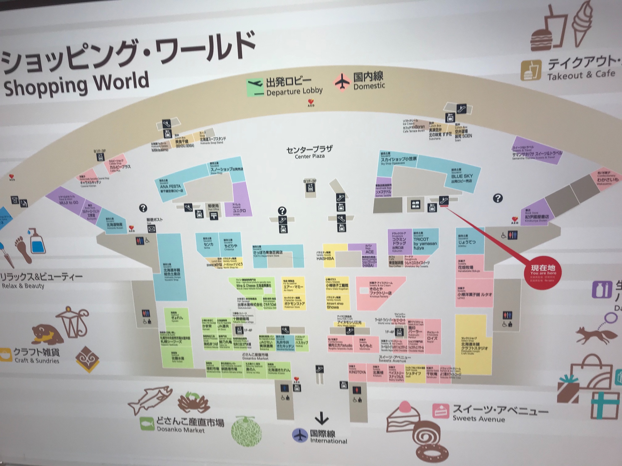 回国的时候如果需要买手办请一定要在国内出发买好再去国际出发办理登机,不然到时入了关你会后悔的。附上一张新千岁机场国内出发的地图。