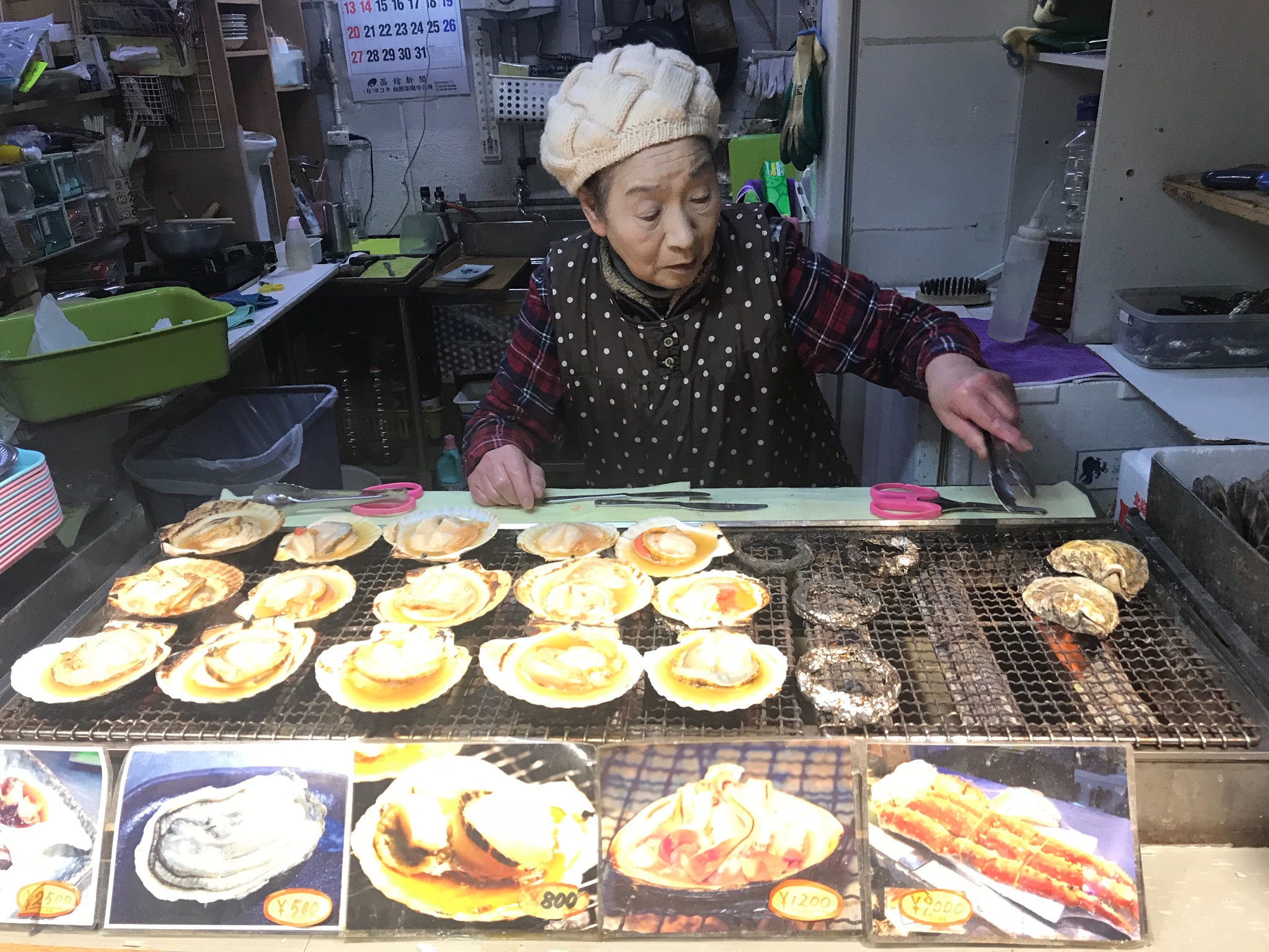 日本老婆婆烤的扇贝和海螺,按个卖。扇贝很鲜,肉质很甜。