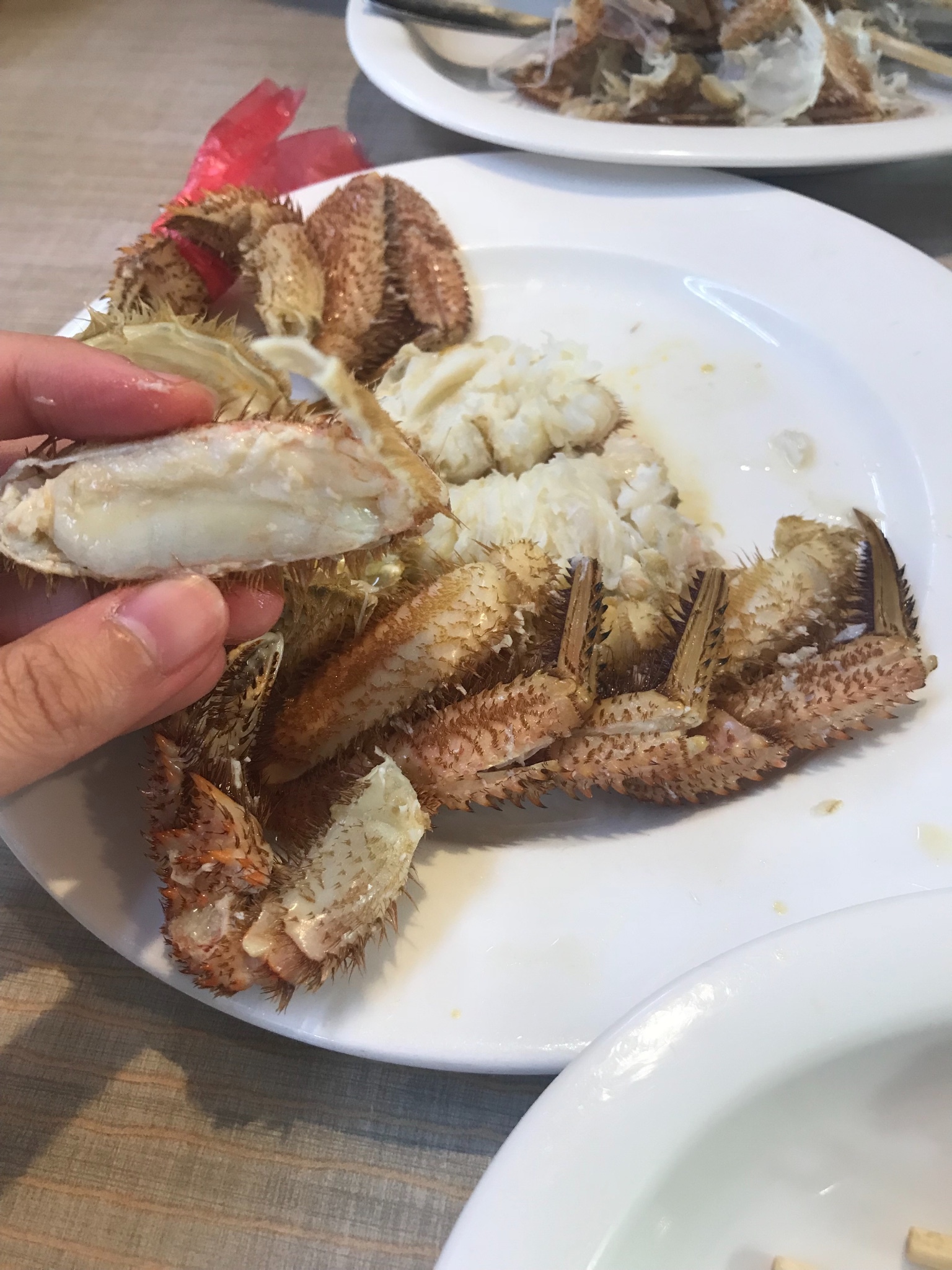 四个人要了两只毛蟹,卖家介绍说毛蟹吃肚子,帝王蟹吃爪子。同行的伙伴说毛蟹是日本特产,因此选择了毛蟹。本没有对毛蟹的腿报有很大的期待,结果肉质意外的肥,而且很好脱皮,皮也十分的薄,两只蟹7500日元。