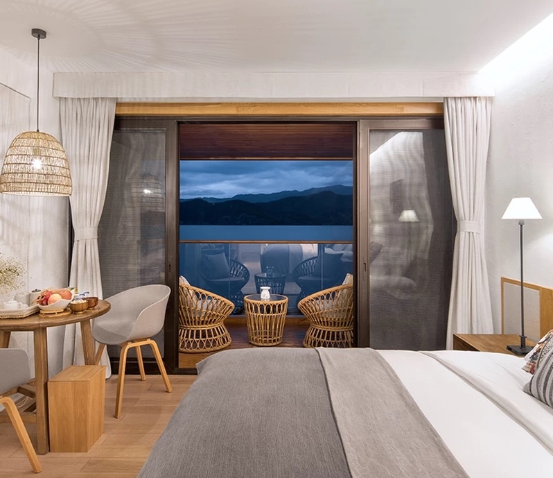 蒗放离丽江较近,不少中高端的新酒店都选址在蒗放。但听说离泸沽湖100米之内的酒店将面临拆除。这一次,我选择了诗莉莉旗下的普阅瓦蓝,该酒店是全地暖,基本都是湖景房,当我到达房间的那一刻,简直觉得美得无法言语,默默为自己点个赞。蒗放可能比不上大洛水的热闹,也比不上里格的景致。但我还是被酒店所深深吸引。