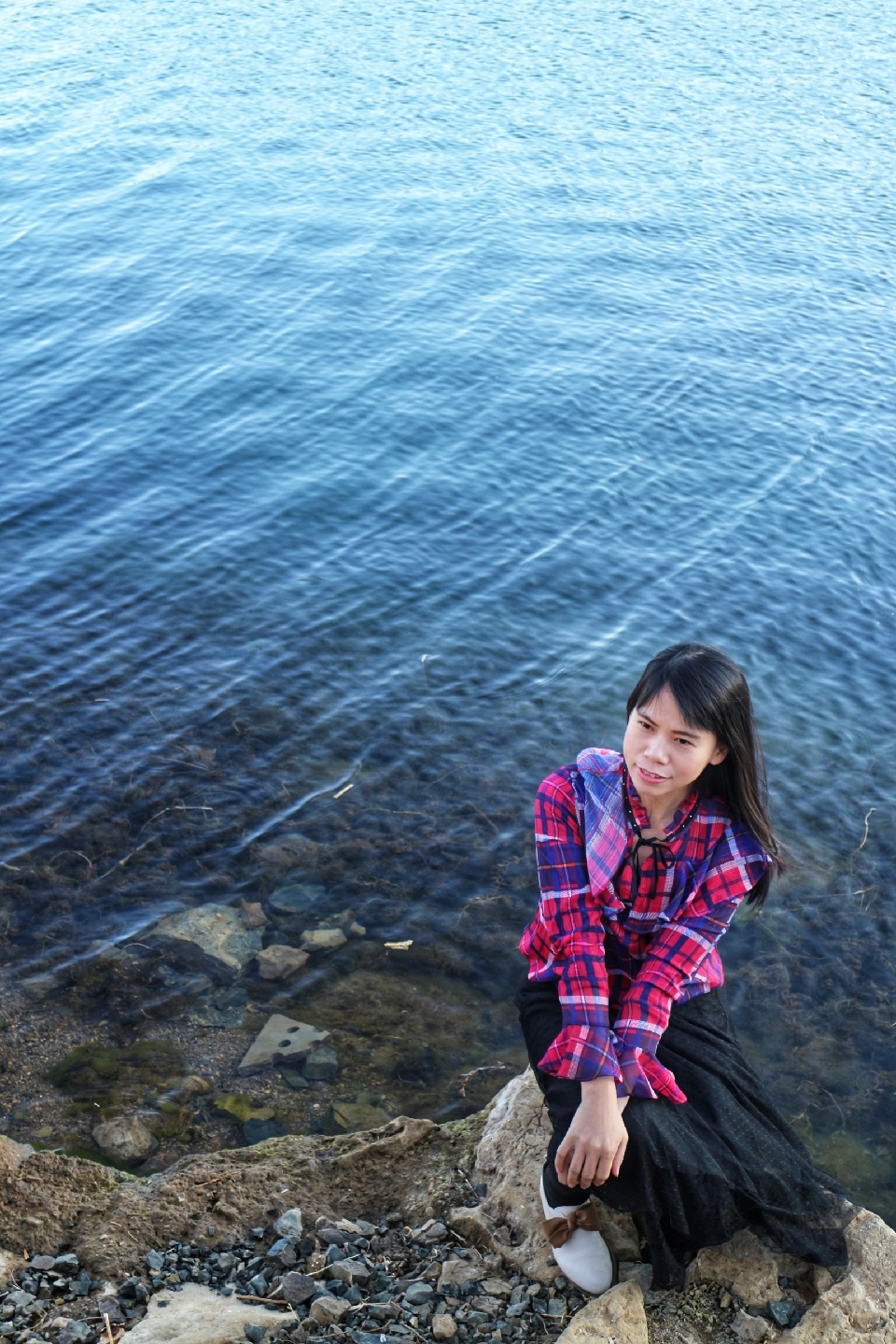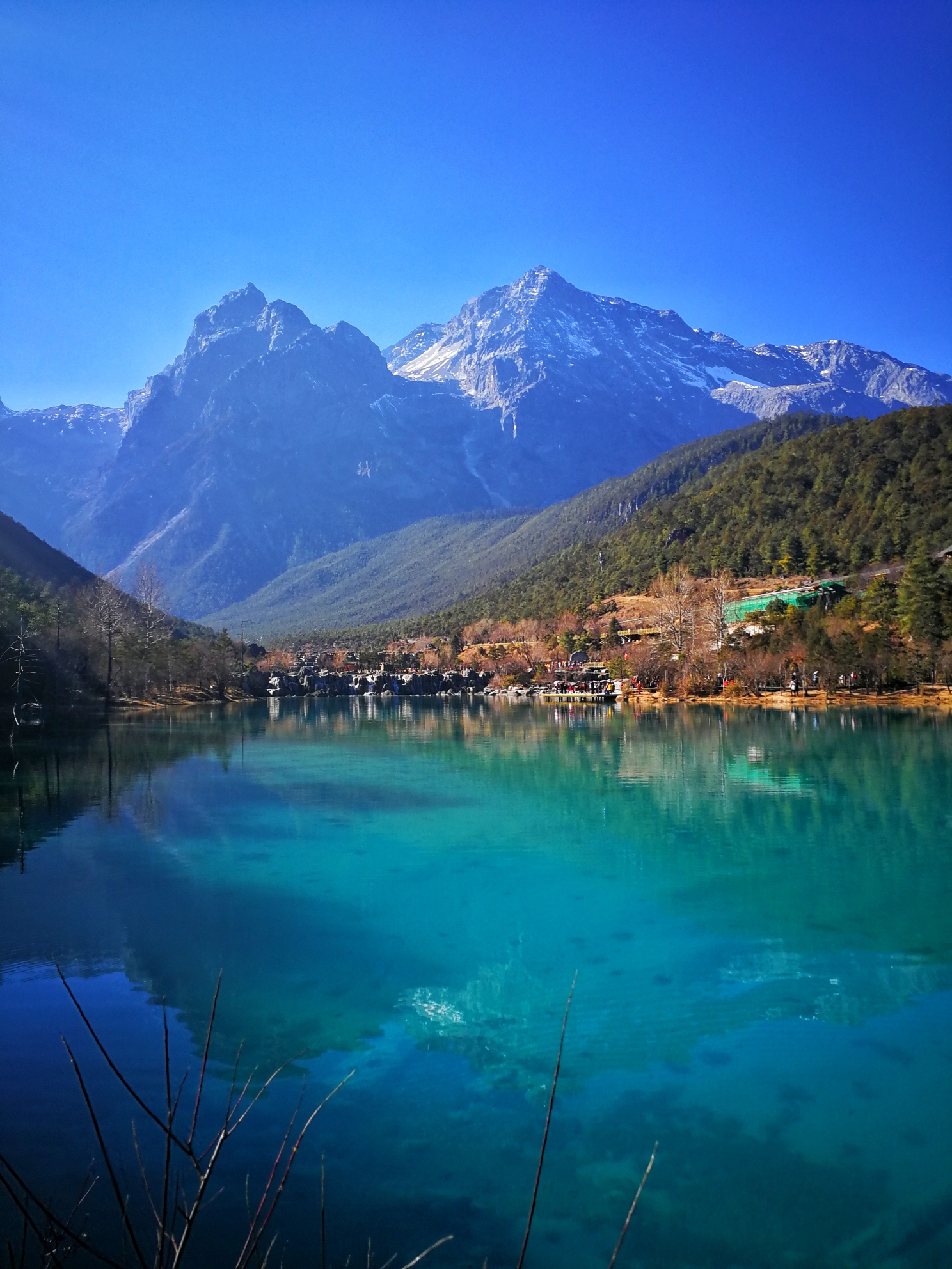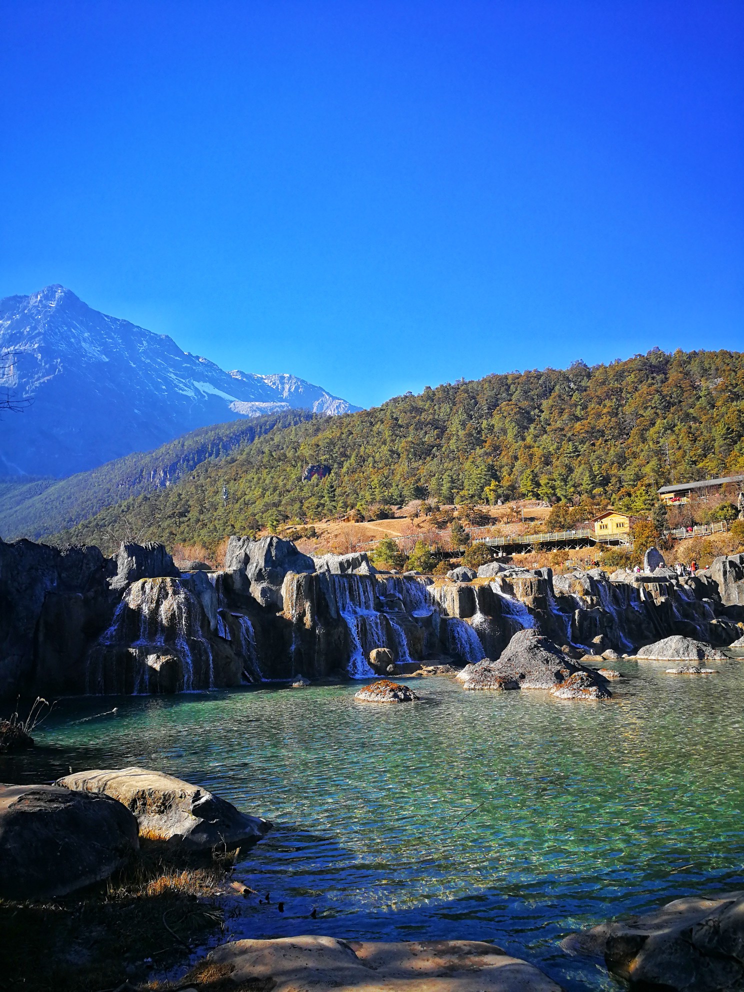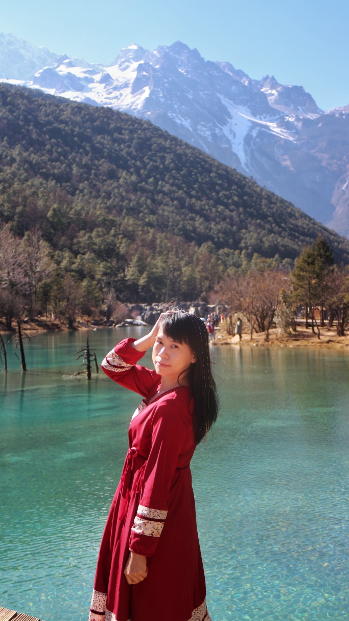 购买蓝月谷的接驳车票后,坐大巴大概几分钟就抵达蓝月谷,当时正值光照最强之时,照射在水面犹如璀璨明珠,水面不同层次的蓝,煞是好看!走走停停,用镜头记录下它的美。蓝月谷的美,只差一个太阳的距离。其实站在阳光下,秋装也能妥妥的驾驭,但一旦在阴暗处,还是离不开羽绒,所以一路走来,我的羽绒始终常伴左右。当然,容易受感的你,还是不要逞强,毕竟在高原地区感冒是一件麻烦事。
