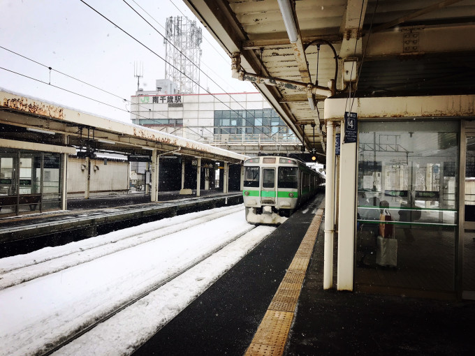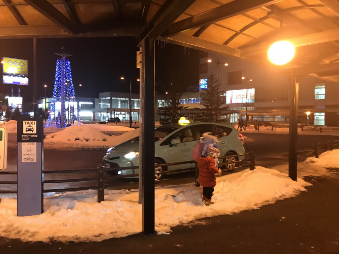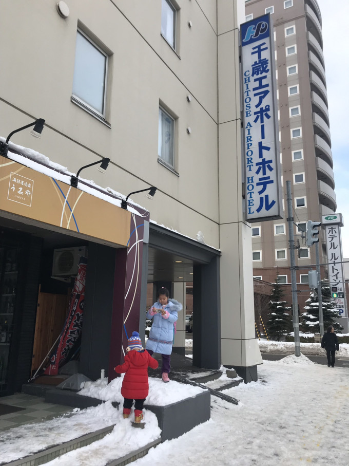 没去设置指定席,很慌乱的见车就上,我们一家四口连同三个箱子1个婴儿车挤在指定席车厢入口处的过道上,等待着下车。还好,大约地铁两站地的时间,我们由新千岁机场出发经停南千岁,到达了千岁站。出站后可以看到一个出租车停靠站,我们已经把行李搬上去了,司机师傅一看酒店地址就又把行李给我们搬下来,说直着走过马路向前走几十米就到了