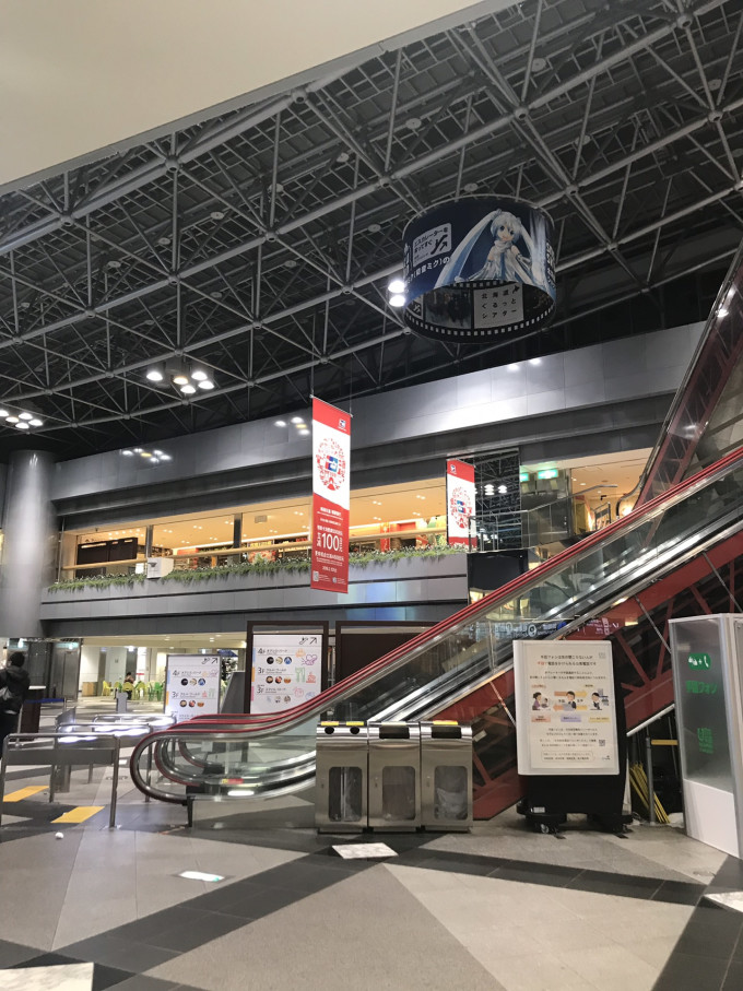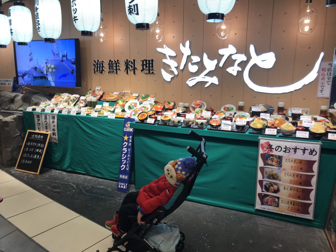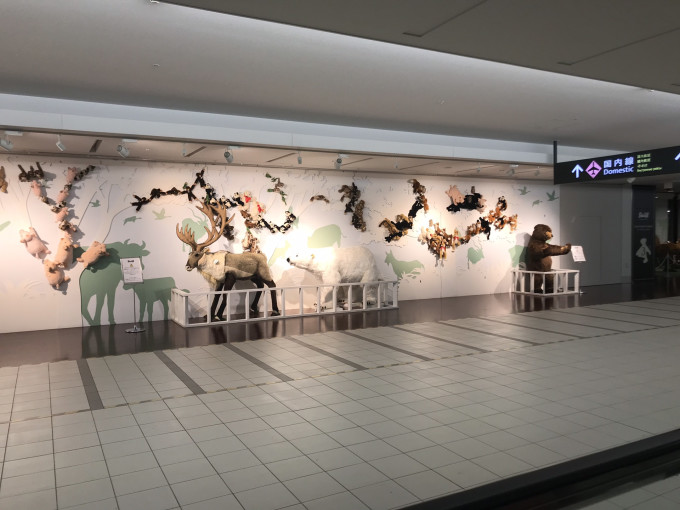 从机舱出来,步行梯两旁是各种毛绒动物组成的景观,孩子们喜欢极了。机场里到处是背着巨大滑雪板包的人,大部分是欧洲人。我们到机场时接近晚上8:00,很多店铺已经休息了,没有实现在机场吃晚餐的计划。按照电梯的指引,下到JR层,购买去千岁的JR票,前往新千岁机场酒店。JR站边上的旅客服务中心已经下班,只能明天再来激活JRPASS了。