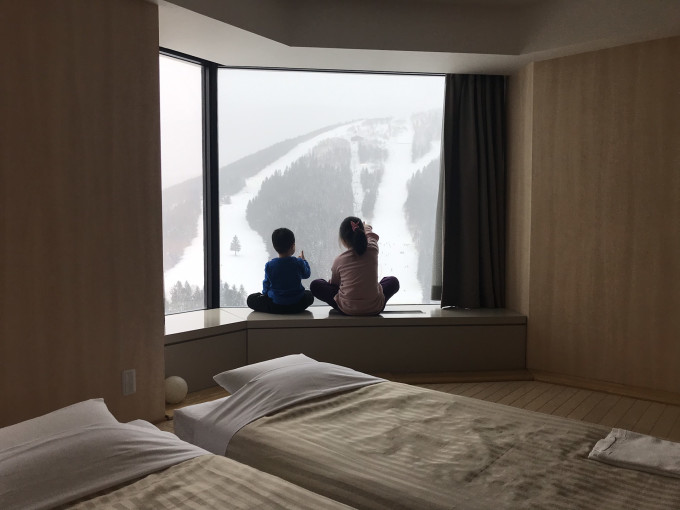 我们住在33层。房间一面全是玻璃窗,正对着高山雪场,景色美极了!